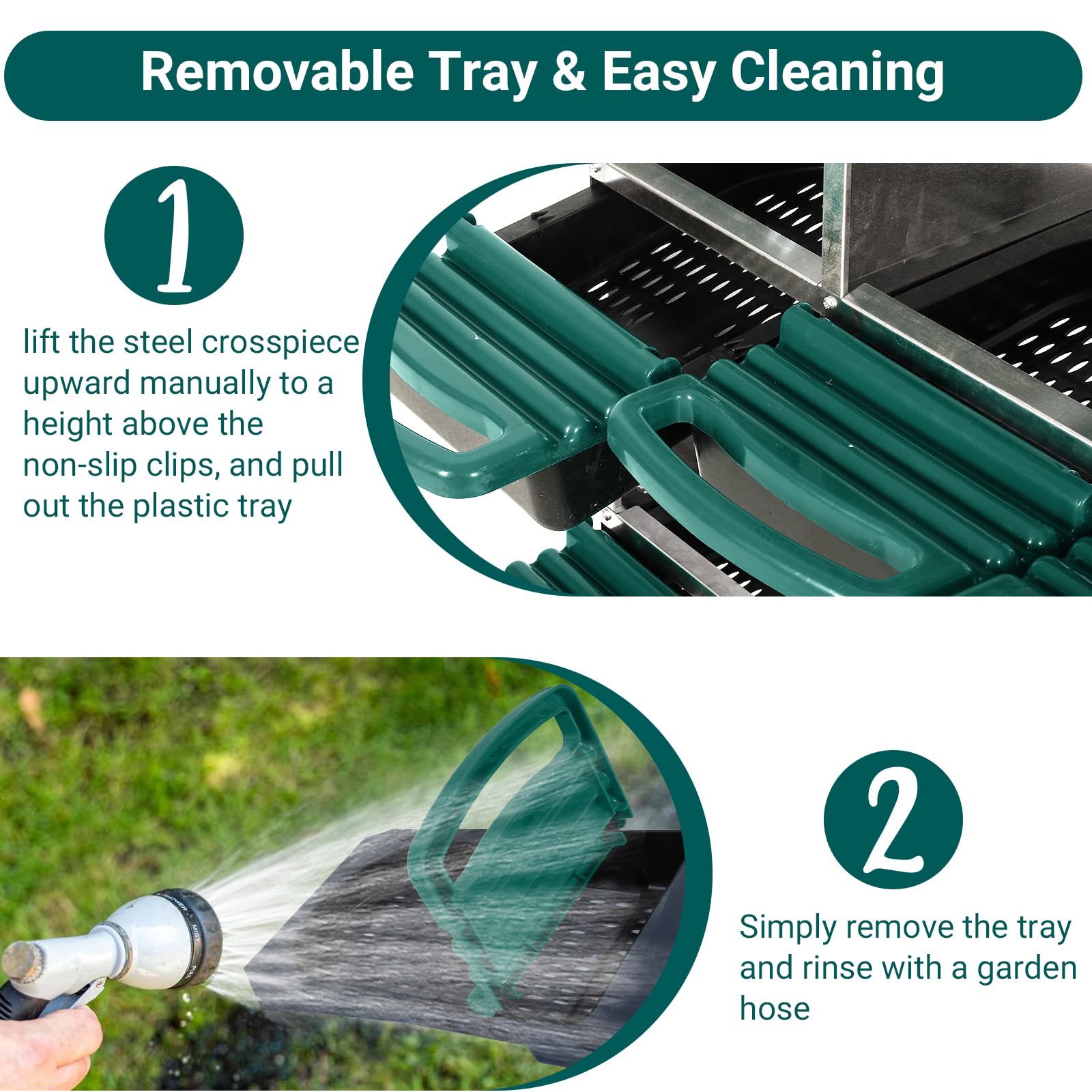 [BUILT TO LAST]Durability meets functionality in our chicken nesting boxes, thoughtfully crafted from rugged galvanized steel for the roof and sides. This ensures long-lasting performance, ventilation holes promote airflow, maintaining a cool and dry environment for your hens. The removable trays, constructed from rust-proof plastic, make cleaning and maintenance a breeze. Invest in a robust product that balances strength with comfort, ensuring your hens enjoy a safe and pleasant laying area.