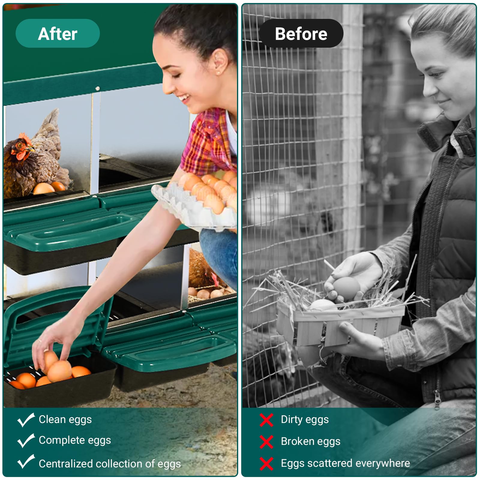 [INNOVATIVE EGG COLLECTION SYSTEM]Transform your egg collection routine with our chicken nesting box design! Featuring a gentle incline, each box allows freshly laid eggs to roll into a conveniently accessible tray, eliminating the hassle of reaching inside the nesting area. This design not only keeps your precious eggs safe but also streamlines daily farm chores. Say goodbye to messy egg collections and hello to an efficient, hassle-free egg harvesting experience that saves you time