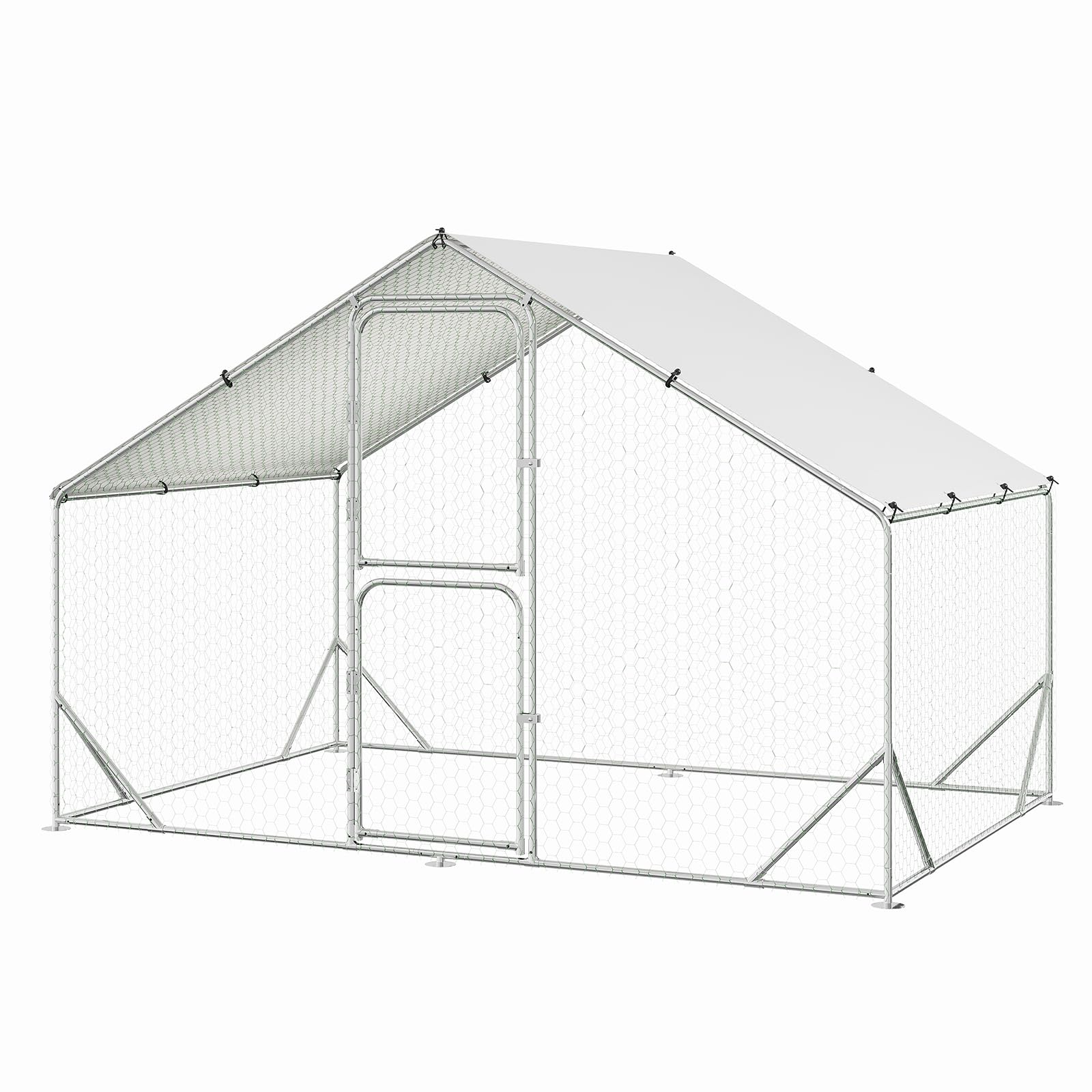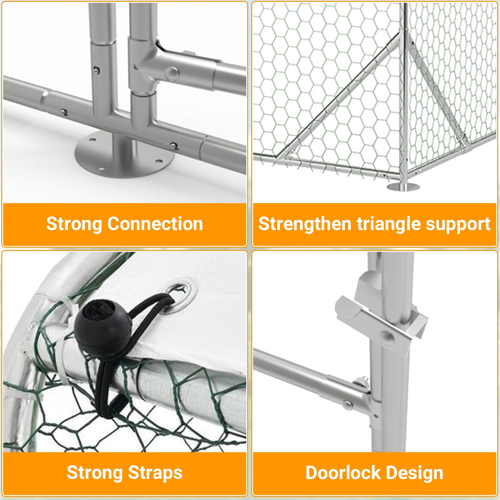 [REINFORCED TRIANGLE SUPPORT FOR STABILITY] Our metal chicken coop is crafted from durable galvanized frames and features a protective hexagonal mesh, ensuring not just security but also longevity. The design includes reinforced triangles at the corners, providing extra strength and stability. This means your chicken coop will withstand the test of time and the elements, giving you confidence in a sturdy and durable shelter for your animals.