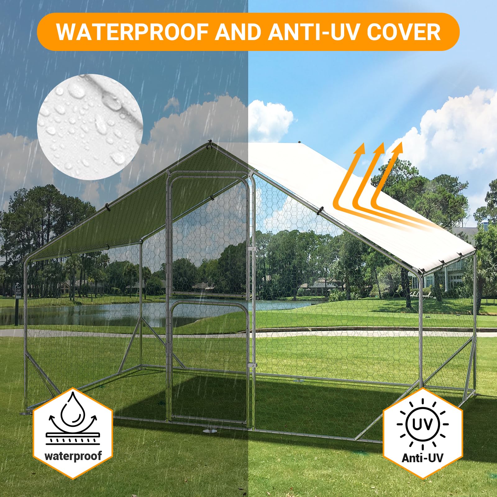 [WATERPROOF AND UV-RESISTANT COVER FOR ALL-YEAR PROTECTION] Your chickens deserve the best protection from the elements, and our waterproof and UV-resistant cover ensures just that. Whether it’s rain, snow, or harmful sunlight, this high-quality cover keeps your chickens dry and safe throughout the year. With this feature, you can rest easy knowing that your pets are shielded from harsh weather conditions, allowing them to thrive in a safe and comfortable environment, no matter the season.