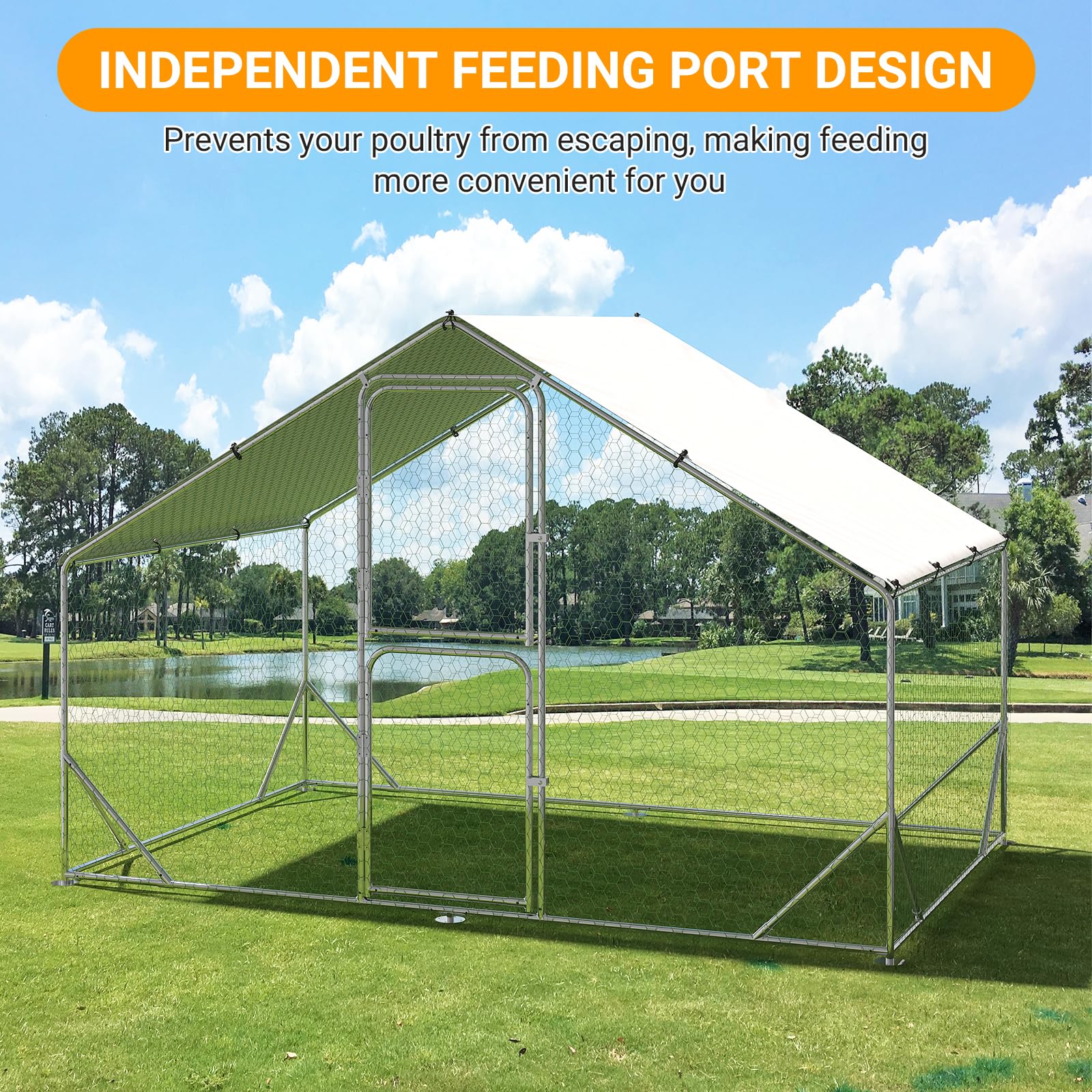 [UPGRADE DOUBLE DOOR FOR CONVENIENCE] Experience hassle-free feeding with our upgraded double door design in the metal chicken run. No more chasing after runaway chickens during feeding time! The innovative top half of the door allows you to easily access your pets while keeping them securely inside. This thoughtful feature ensures that you can effortlessly feed your chickens without any worries of them escaping. Enjoy the peace of mind that comes with convenient, stress-free feeding.
