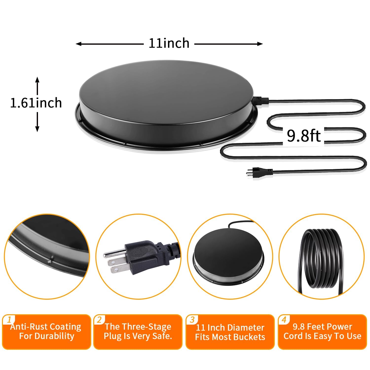 Suitable for Plastic & Metal Waterers: Large Chicken Water Heater, with a Diameter of 11 Inches, Suitable for Most Water Buckets, Including 5-Gallon Feed Buckets. The Power Cord is 9.8 Feet Long, Which Is Sufficient for Your Use. The Chicken Water Heaters Are Also Equipped with a Three-Prong Plug for Safe Usage. This product is compatible with both plastic and metal waterers, but it is important to ensure that plastic waterers contain water for optimal heating performance