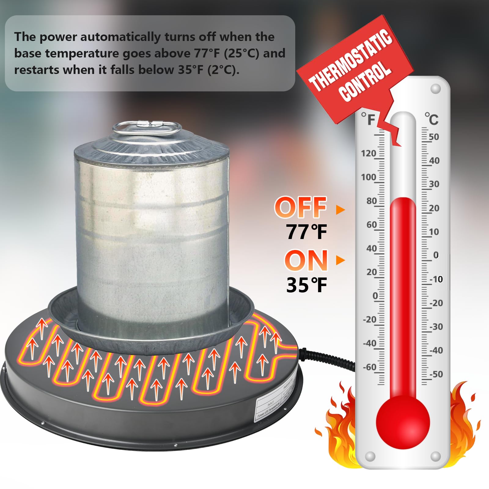đăSmart Thermostatic ControlăWith a 125W thermostatic control heater, the poultry water heater automatically heats when below 35°F and stops at 77°F, providing poultry with the perfect drinking water temperature for improved health and productivity.