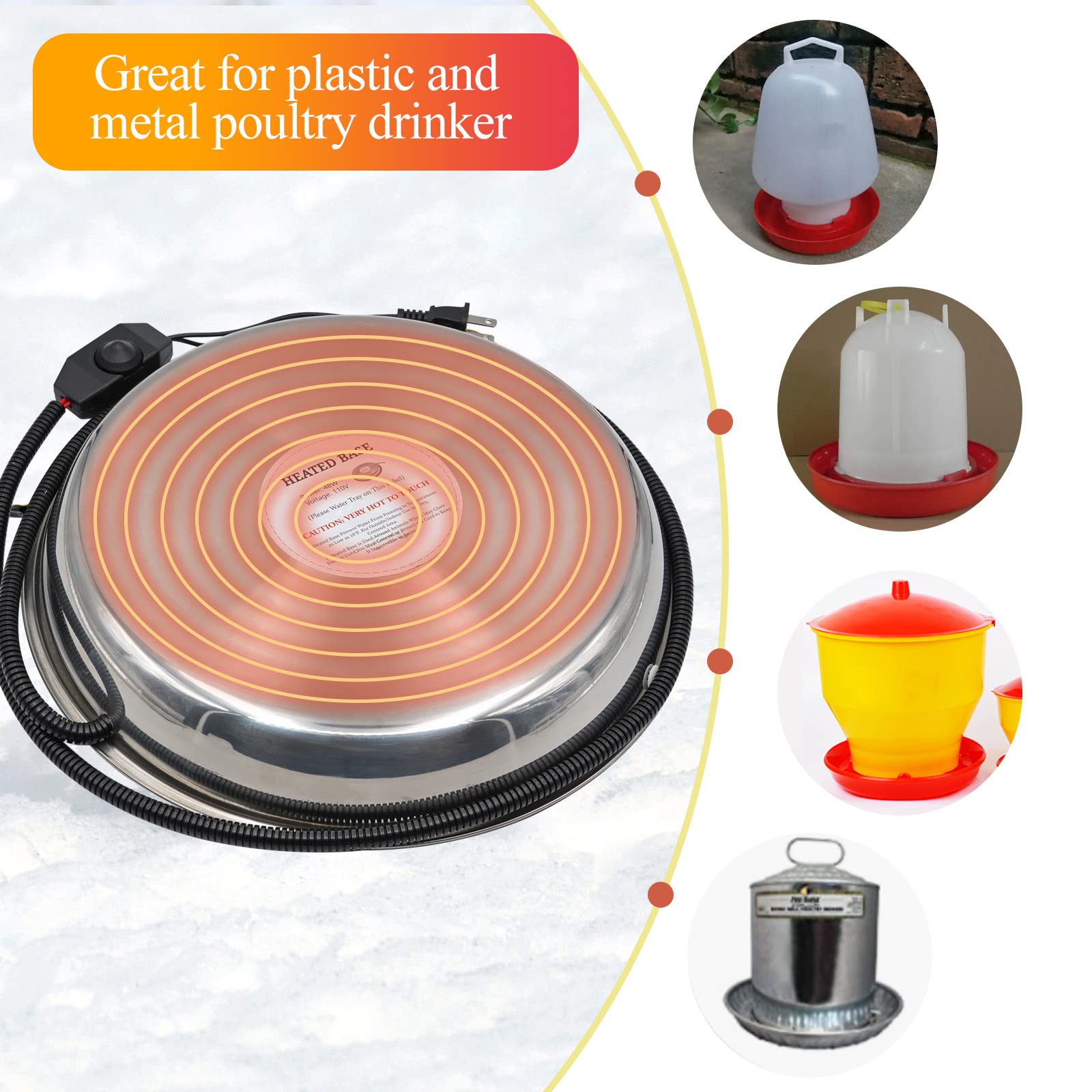 MATERIAL OF CHICKEN DRINKER BASE: The stainless steel heated waterer base is perfect for outdoor or indoor coops and freezing winter temperatures, which provides consistent gentle heating water without scalding your chicken, darks, birds, quails, dog, cat, or animal's mouth.
