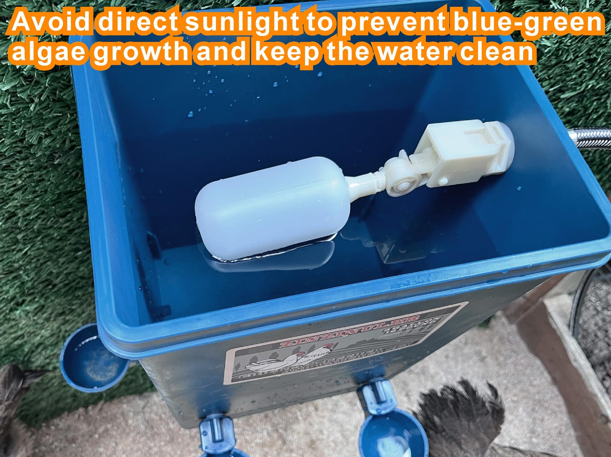 Automatic Chicken Waterer with Float Valve Control - This chicken waterer includes a 60-inch water supply pipe that connects to an external hose for a continuous water supply, eliminating daily manual refills. Simply turn on the faucet, and the float valve will automatically shut off when the tank is full. The waterer features 3/4-inch and 5/8-inch threaded connections, making it compatible with most garden hoses or faucets. It also offers two drinking modes—nipple type and cup type—so you can choose the best method for your chickens’ preferences.