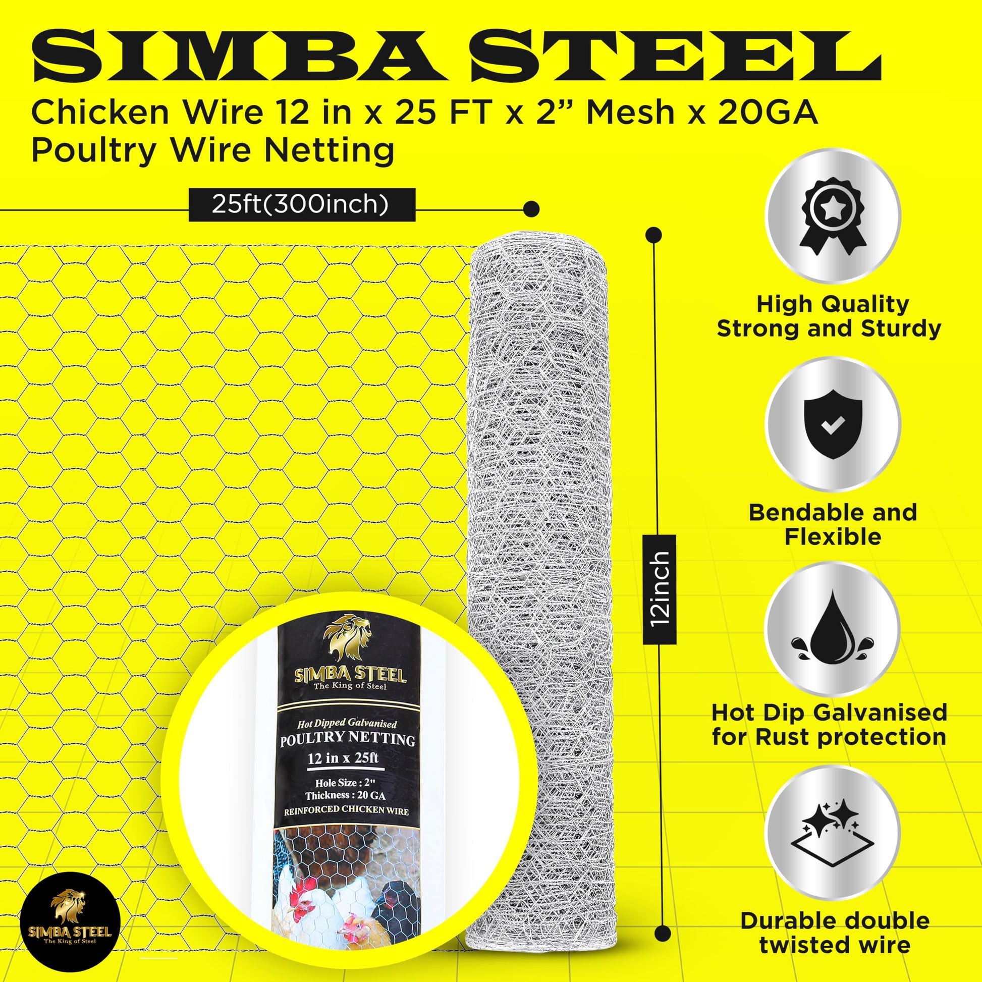 Chicken Wire 12 in x 25 FT x 2” Mesh x 20GA | Poultry Wire Netting | Hot Dipped Galvanised | Hexagonal Galvanized Mesh for Chicken Coop, Rabbit Cage, Fence Barrier PM12x25x2