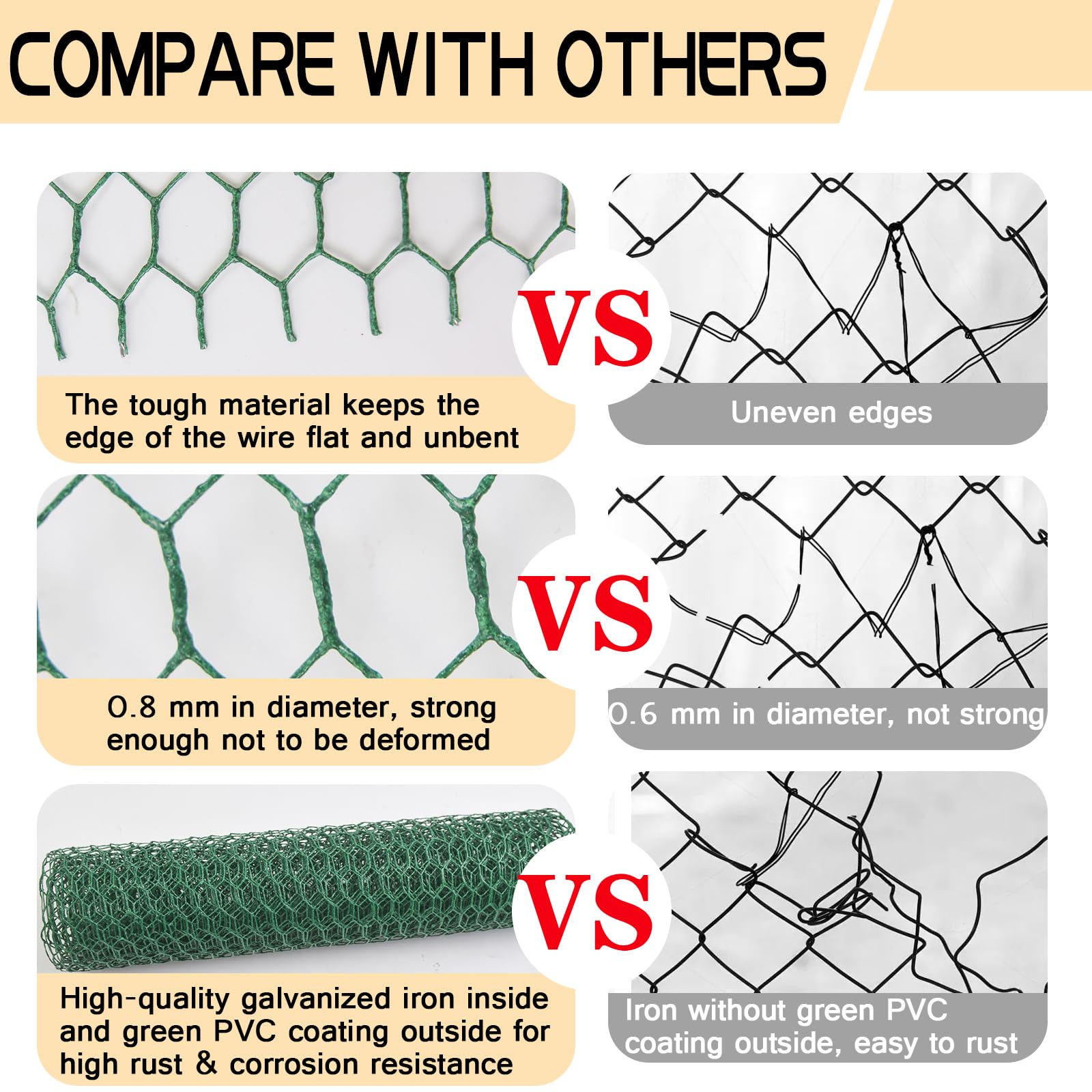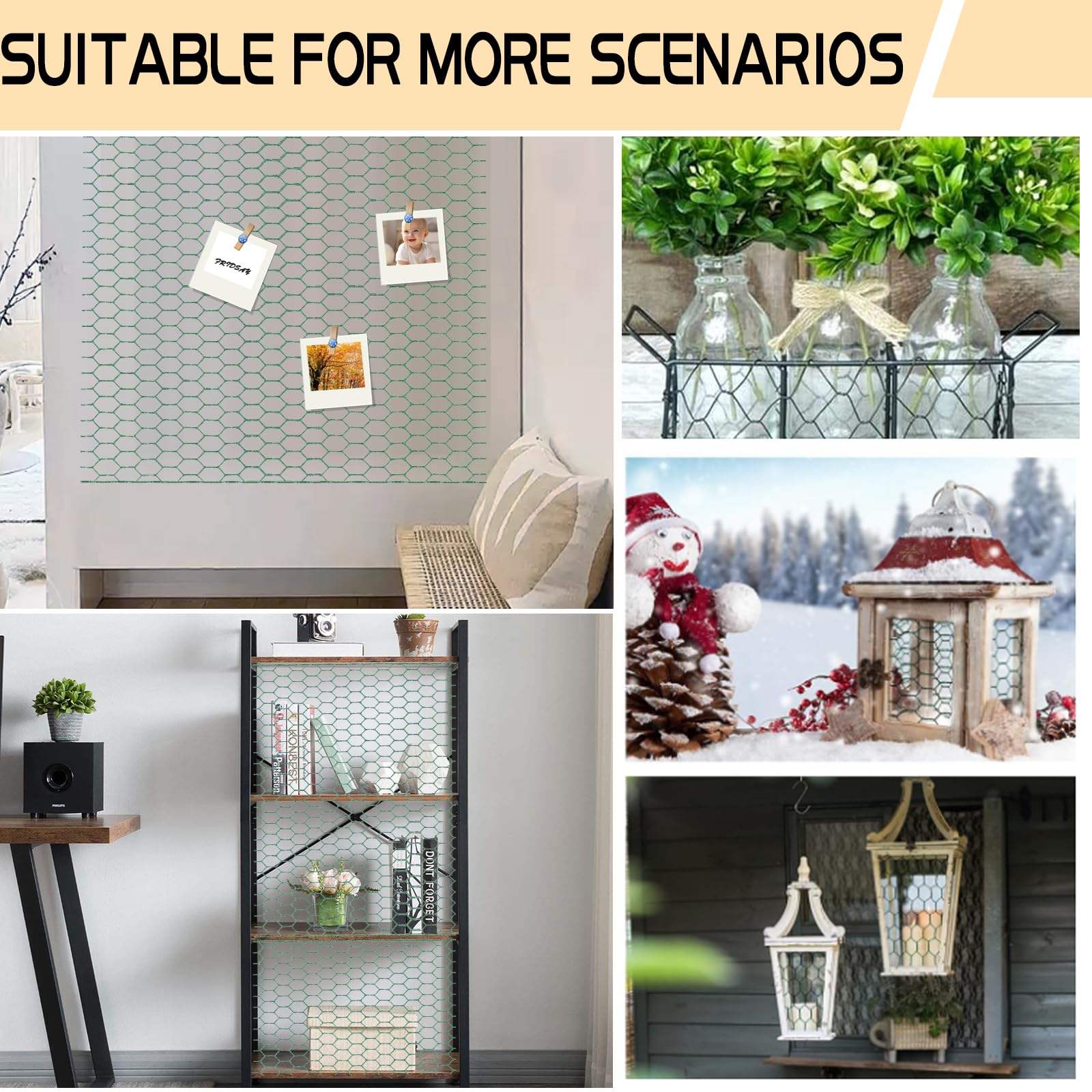 【Wide Application】Perfect green chicken wire for floral arrangements for wedding. This galvanized chicken wire netting can create many home crafts, such as craft fruit baskets, pet cage safes, Christmas wreath frames, photo walls, jewelry racks, craft wire mesh, moss pole, cabinet door replacement, making animal models, any large projects, etc. Have fun and create your own DIY crafts with chicken wire fencing.