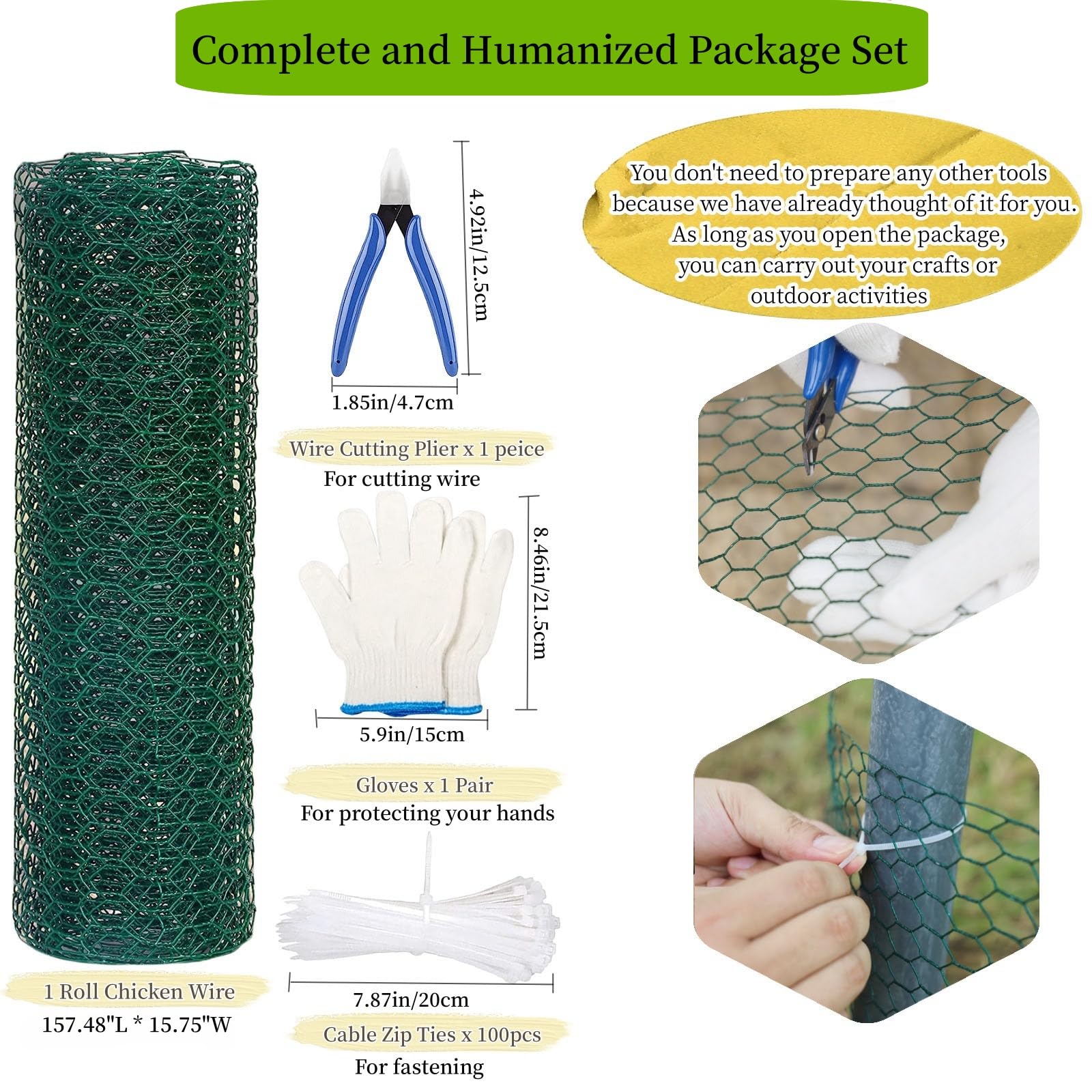 ✅【Suitable Size & Perfect Chicken Coop Accessories】The size of each roll of chicken netting is 15.75" x 157.48" (13.12ft)~40CM x 400CM; In addition, we also provide perfect accessories for any personalized design: a pair of gloves to protect your hands; 1 small industrial grade pliers for easy cutting of chicken wire fence; 100 cable zip ties can be used for corner reinforcement