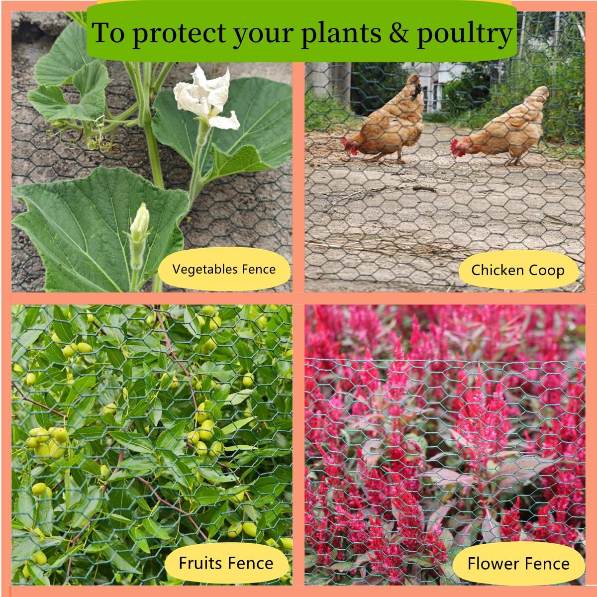 ✅【Rust-proof & Safety】Made of double-layer galvanized and green PVC Coated, it has high corrosion resistance and rust resistance, making it very suitable for outdoor use, ensuring that the chicken wire fencing will not get rusty and age even after exposure to sunlight and rain, effectively extending its service life. In addition, PVC coated is soft, preventing animals from approaching or people from being cut while cutting