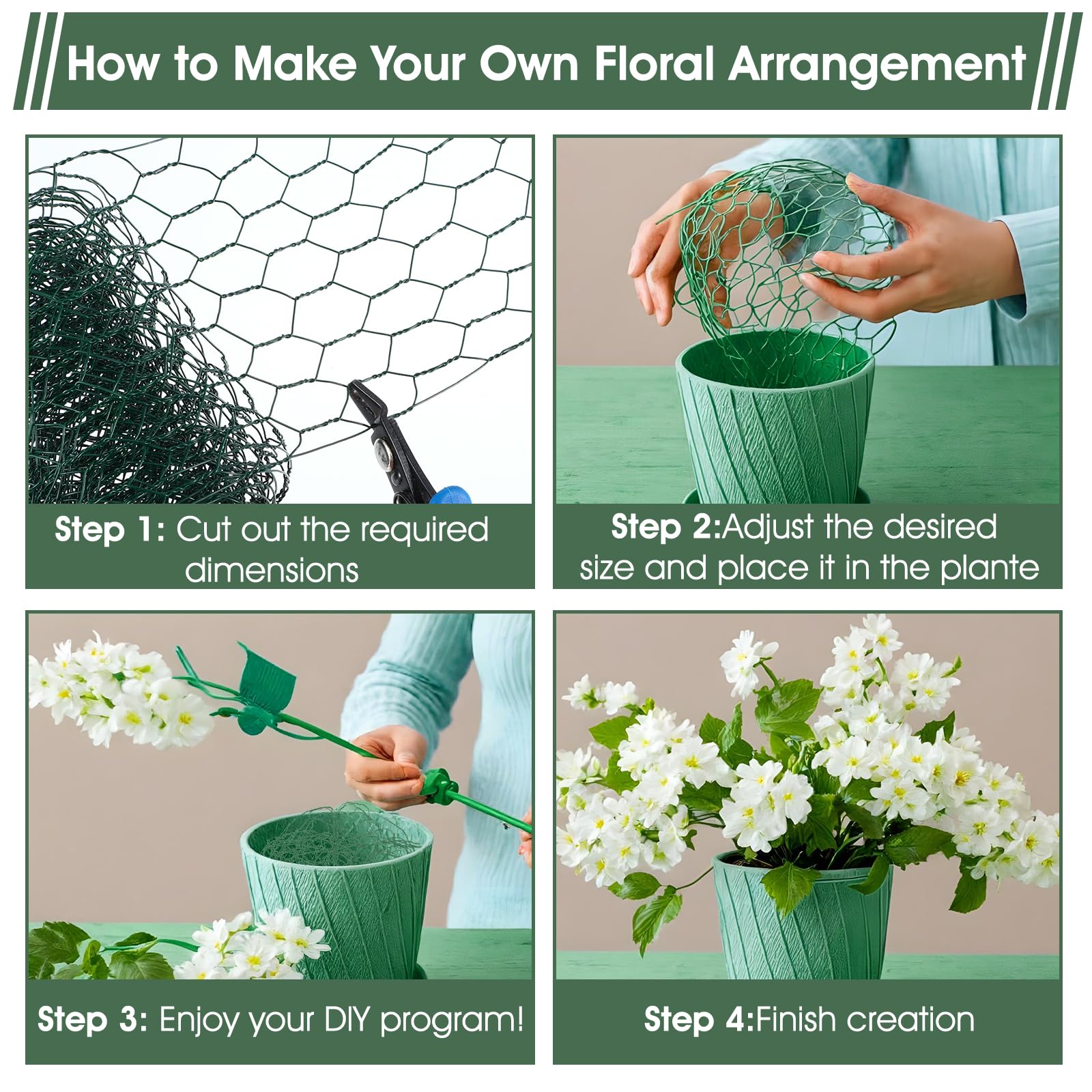 Applicable scenarios: Our roll of chicken wire can not only be used for flower arches, flower arrangements and plants, but also can be used to make various home crafts, such as Christmas wreath stands, photo stands, DIY flower decorations, canning decorations, etc