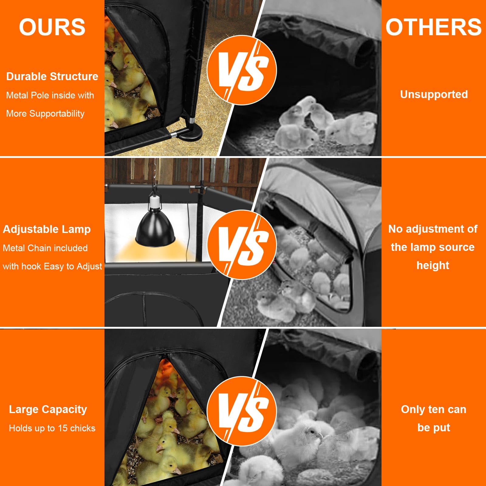 Built to Last: Featuring a robust stainless steel frame and waterproof Oxford fabric, this brooder box delivers unmatched durability while maintaining a warm, dry shelter for chicks, ducklings, and quail—rain or shine.