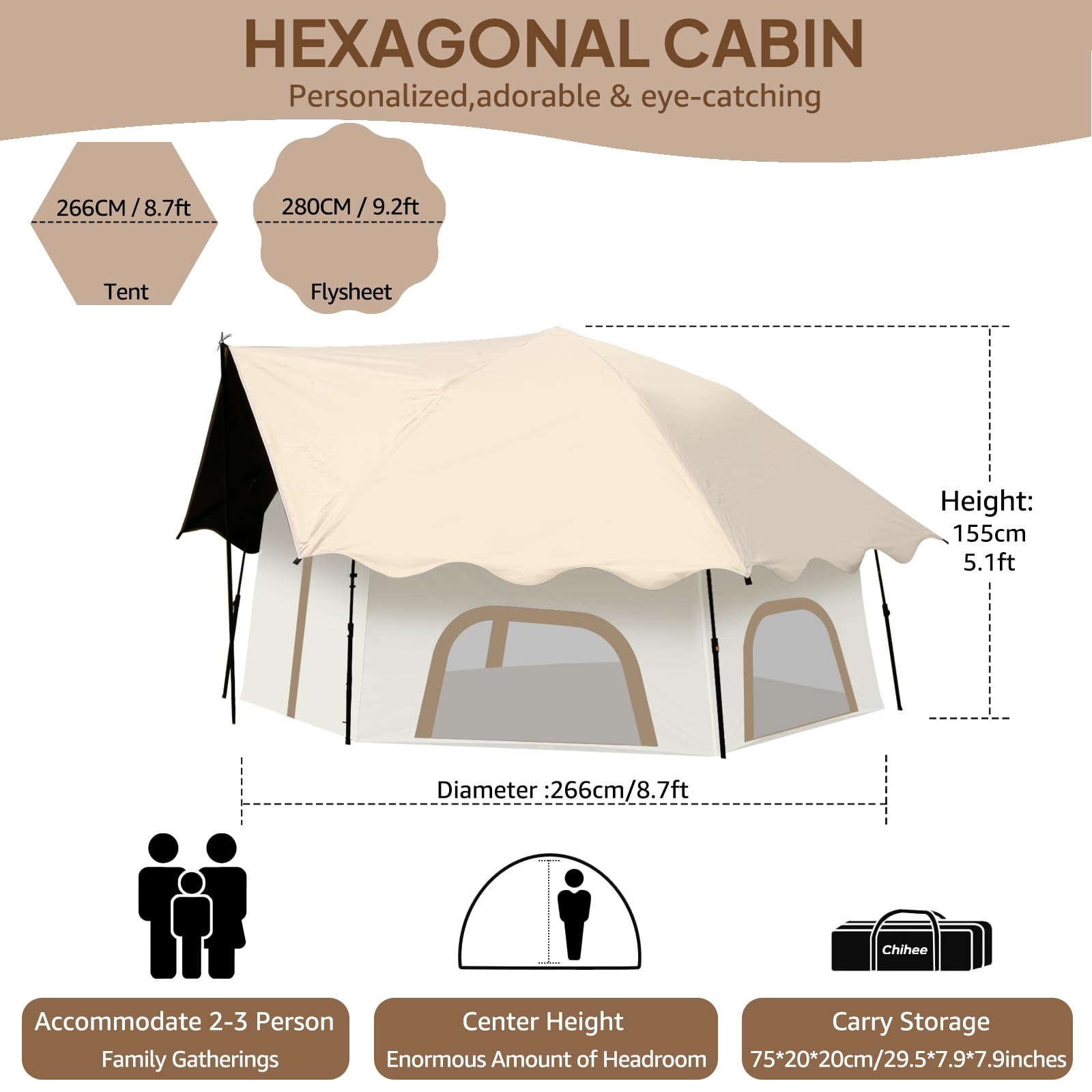 Spacious Charming Hexagonal Structure:Its generous dimensions of 280x280x155cm ensure ample space for 2-3 people,allowing everyone to move around freelymaking it ideal for group camping adventures.Features an elevated internal height that allows you to stand upright almostly and move with ease,enhancing your overall camping experience.Stand out at the campsite with the charming hexagonal design of our tent, reminiscent of traditional Mongolian yurts.