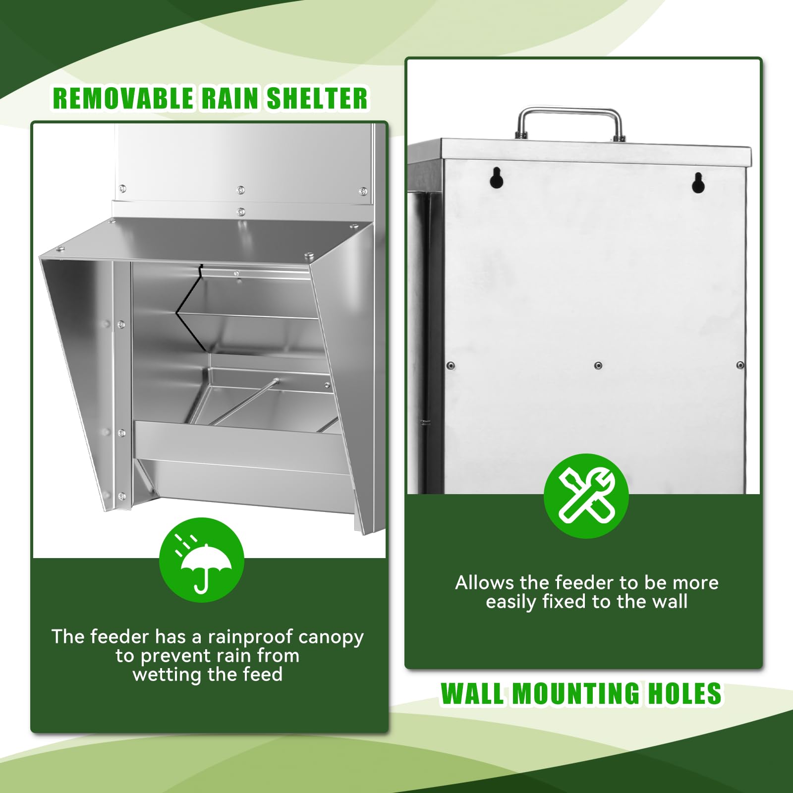 【Rainproof Canopy & Wall Mounted Design】 The built-in rainproof canopy design not only ensures that the rain will not fall into the trough, but also ensures that there will be no water seepage, which makes it an excellent outdoor automatic chicken feeder. Designed with wall mounted screw holes on the back and comes with 2* expansion screws, not only can you put the feeder on the ground, but also hang it on the wall of the chicken coop.