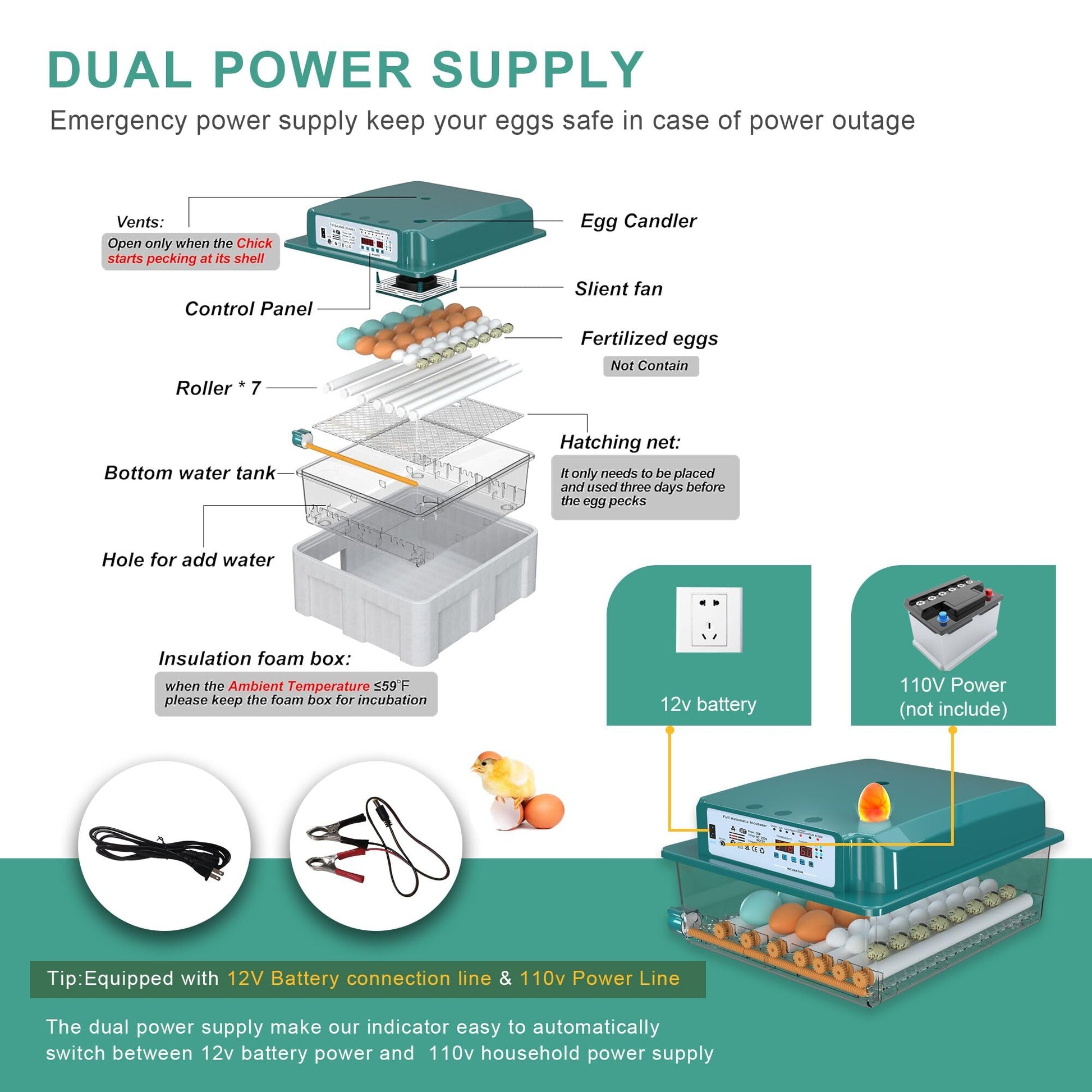 Dual Power Supply with Automatic Switching Function:Our egg incubator machine supports access to 110V power and 12V battery power at the same time.When the power is off, the machine will automatically switch to 12v battery power, and when the power is called, the machine will automatically switch to 110v household power supply