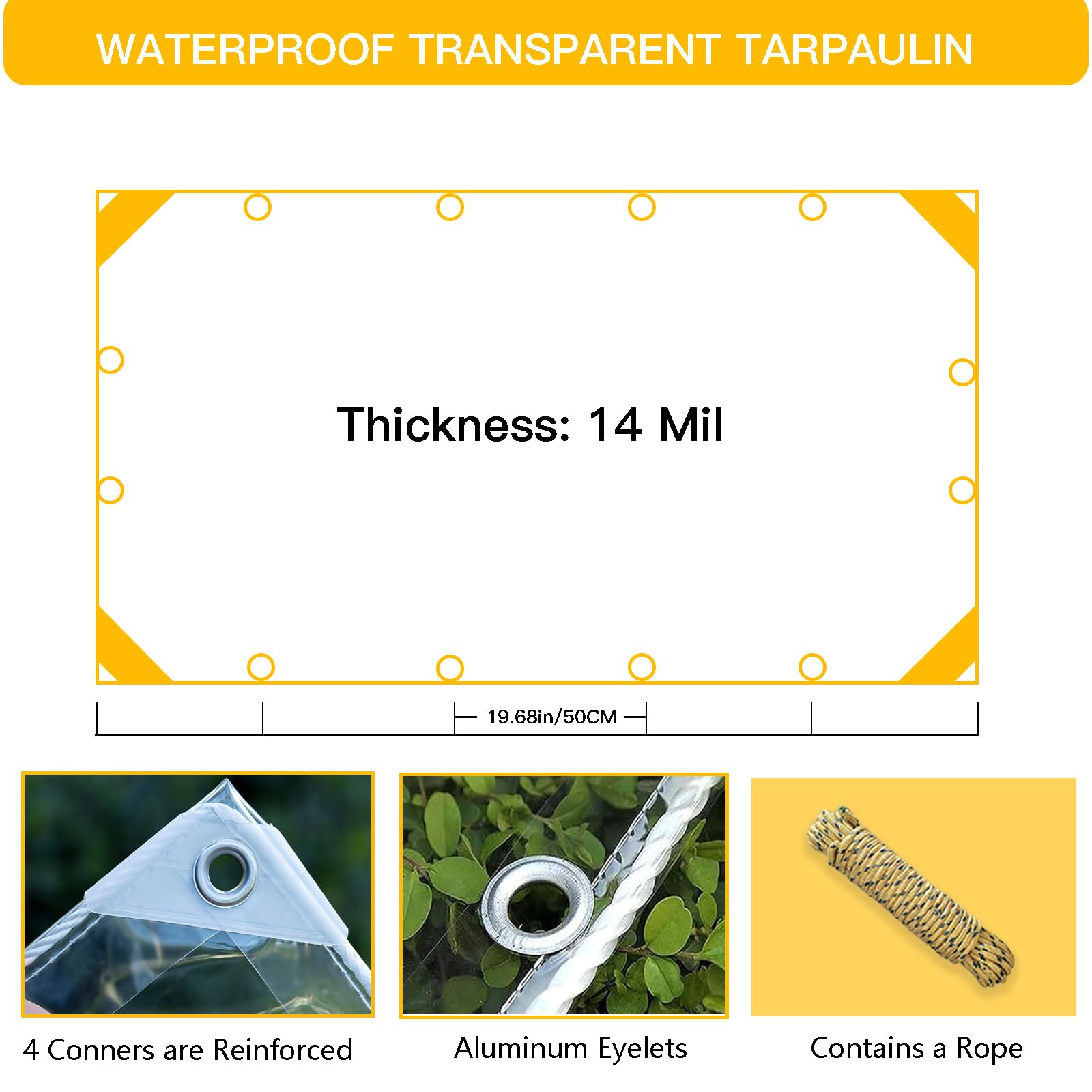 【14 Mil Durable Tarp For Long-lasting Protection】: Clear Tarpaulin -- 14 Mil Durable Heavy Duty PVC Vinyl Tarps. The four corners are reinforced by plastic plates and small metal holes. Each tarp will undergo a tear test to ensure the durability of the product.