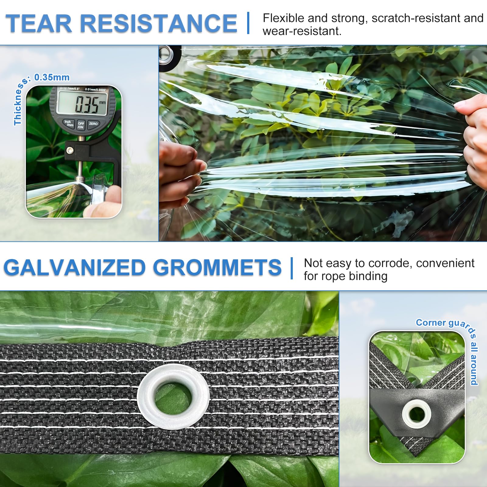 【14 Mil Durable Tarp】the clear tarps with grommets thickness is 14 Mil, eyelet diameter is 0.79 in and the distance is 19.7 in, weight is 420 g/m².The four corners are reinforced by plastic plates and small metal holes. Each clear plastic tarp will undergo a tear test to ensure the durability of the product.