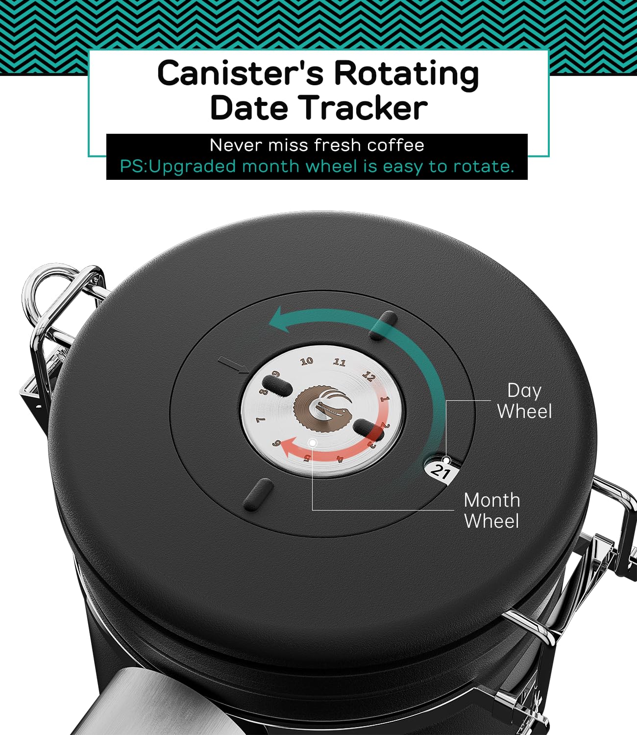 Built-In Date Tracker : Never guess freshness again with the easy-to-use date tracker to monitor your coffee’s peak flavor period and ensure every brew tastes like day one. In addition, the stainless steel coffee Measuring scoop can be easily hung on the side of the coffee jar for easy use