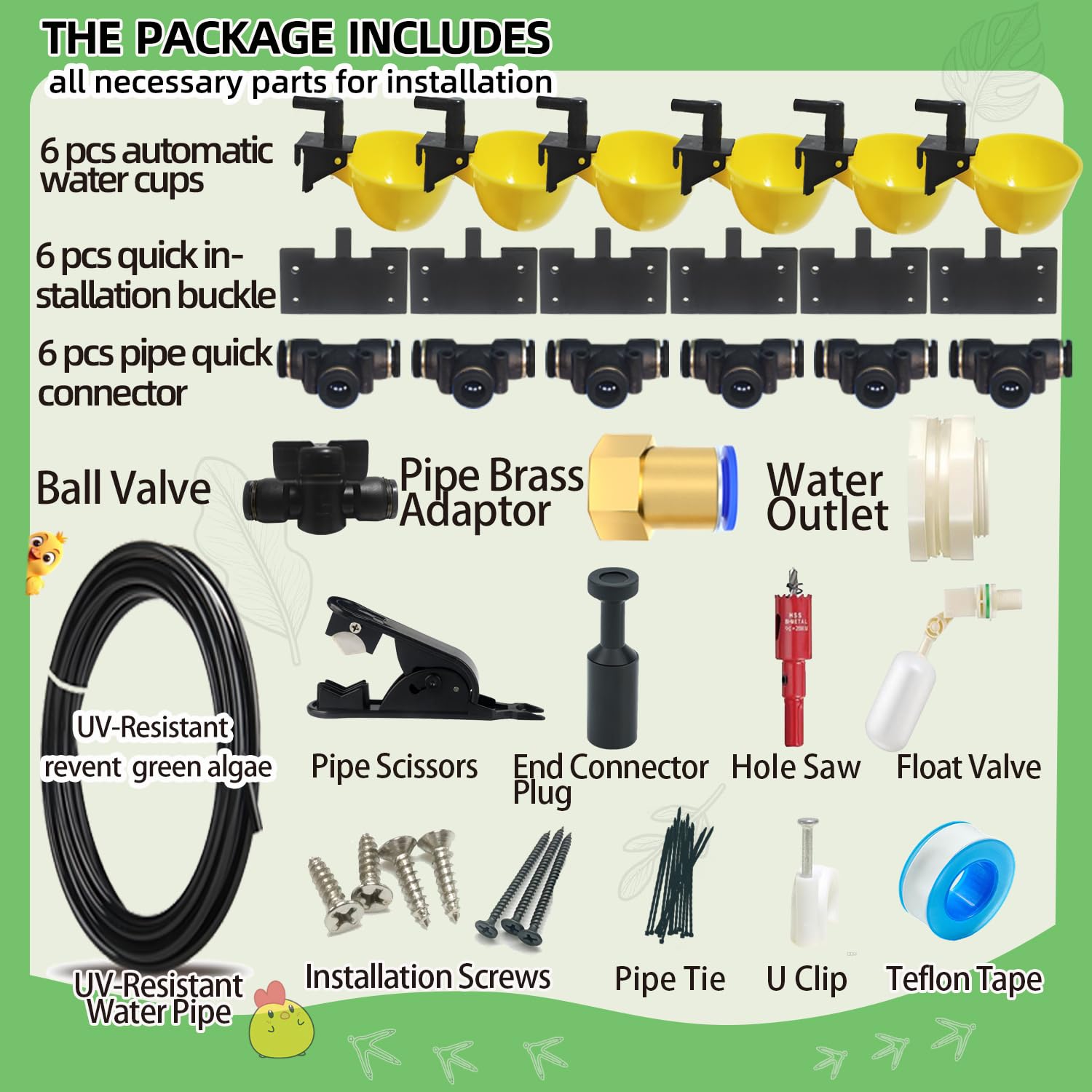 【All-in-one, complete set of accessories required for installation】Includes 6 chicken water cups, 18ft-long UV-resistant water pipe, 6 connectors, an automatic water-filling float ball valve, a hole saw, and other necessary accessories. The water system is Suitable for 3 types of inlet pipes, 1/2 " Female, 3/4 " Female and 3/4 " male inlet pipes
