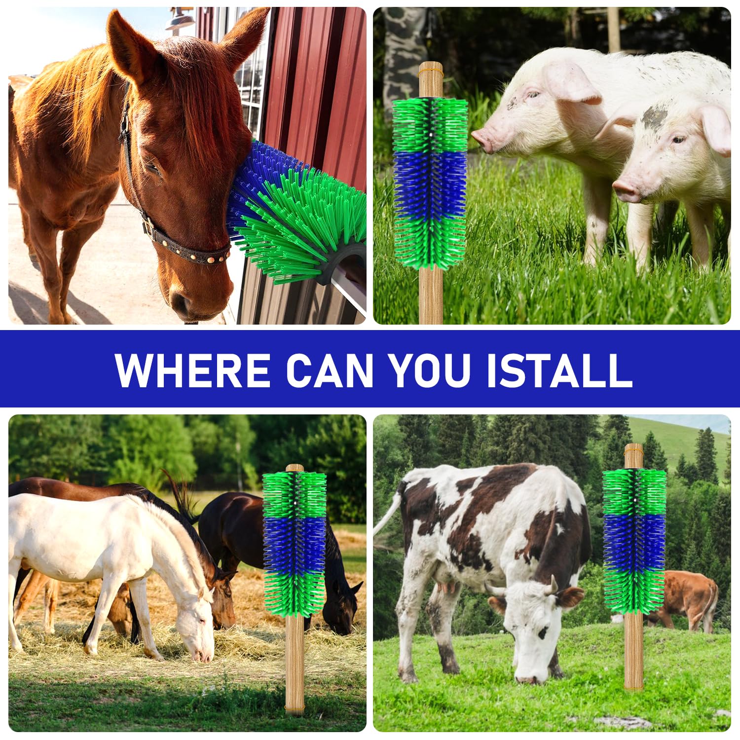 Easy to Install: The horse brushes for grooming includes 1 brush, two different screws. Securely fastened to fences, corrals, stables, or any outdoor location, it may flex to accommodate stumps or fence posts
