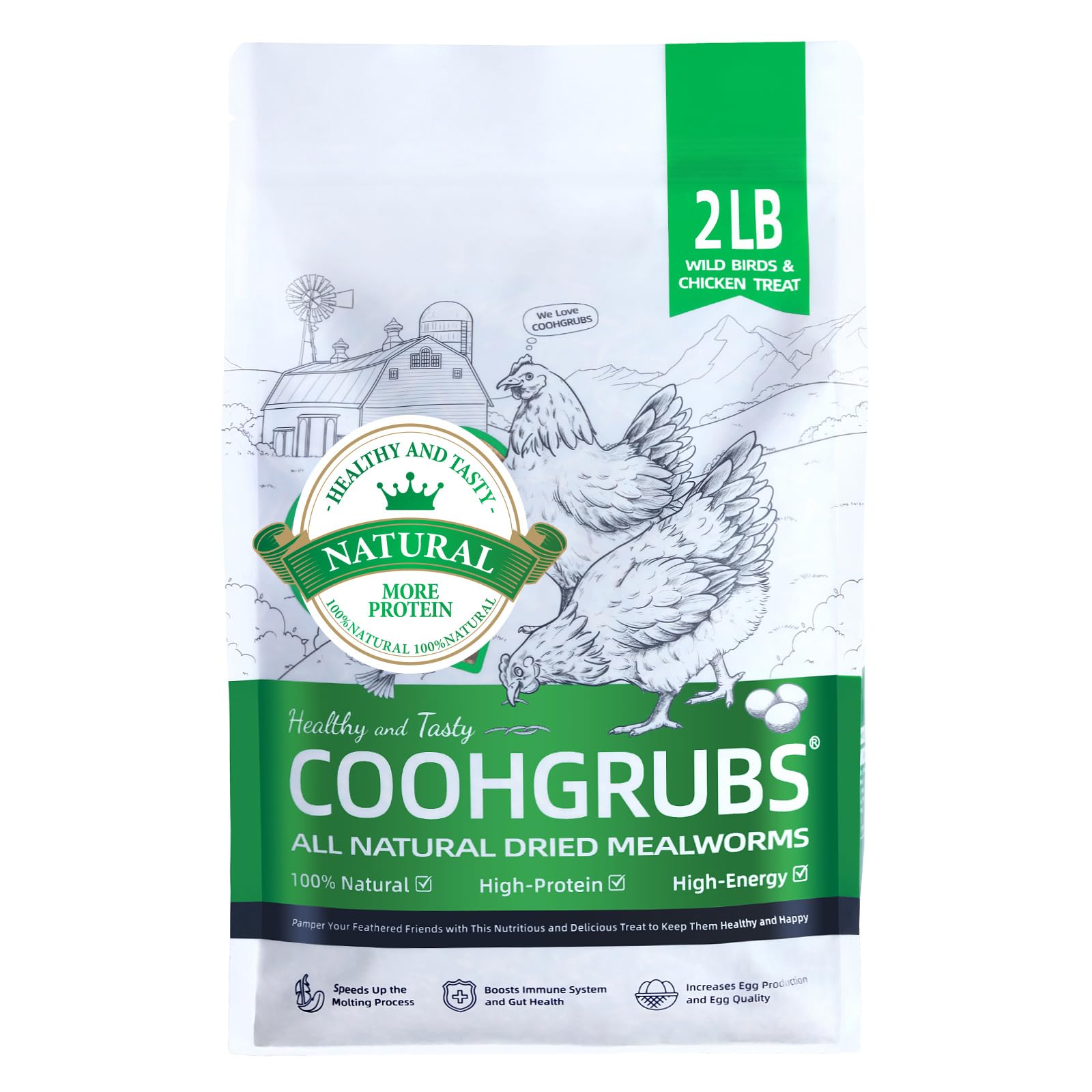 Premium Nutrition for Chickens & Birds: COOHGRUBS mealworms are raised on a wholesome, organic diet of wheat bran, corn, soybeans, and vegetables. Loaded with 58% protein, 25% essential amino acids, and healthy fats, they fuel strong feather growth, consistent egg-laying, and all-around vitality.