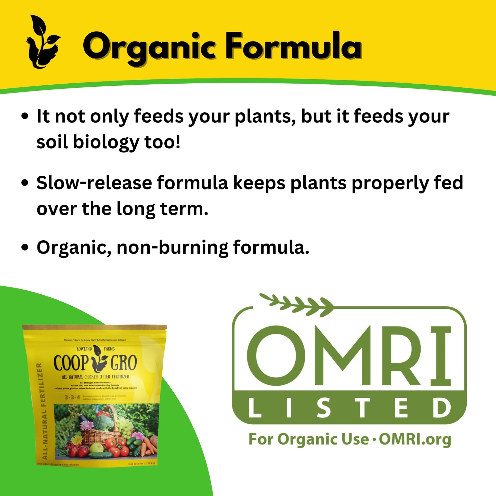 ORGANIC GARDENING: Coop Gro Fertilizer is sustainably produced and OMRI certified for organic vegetable production. We use chicken litter from our own chicken farm to create an easy-to-use, pelleted fertilizer that will feed your plants like nothing else!