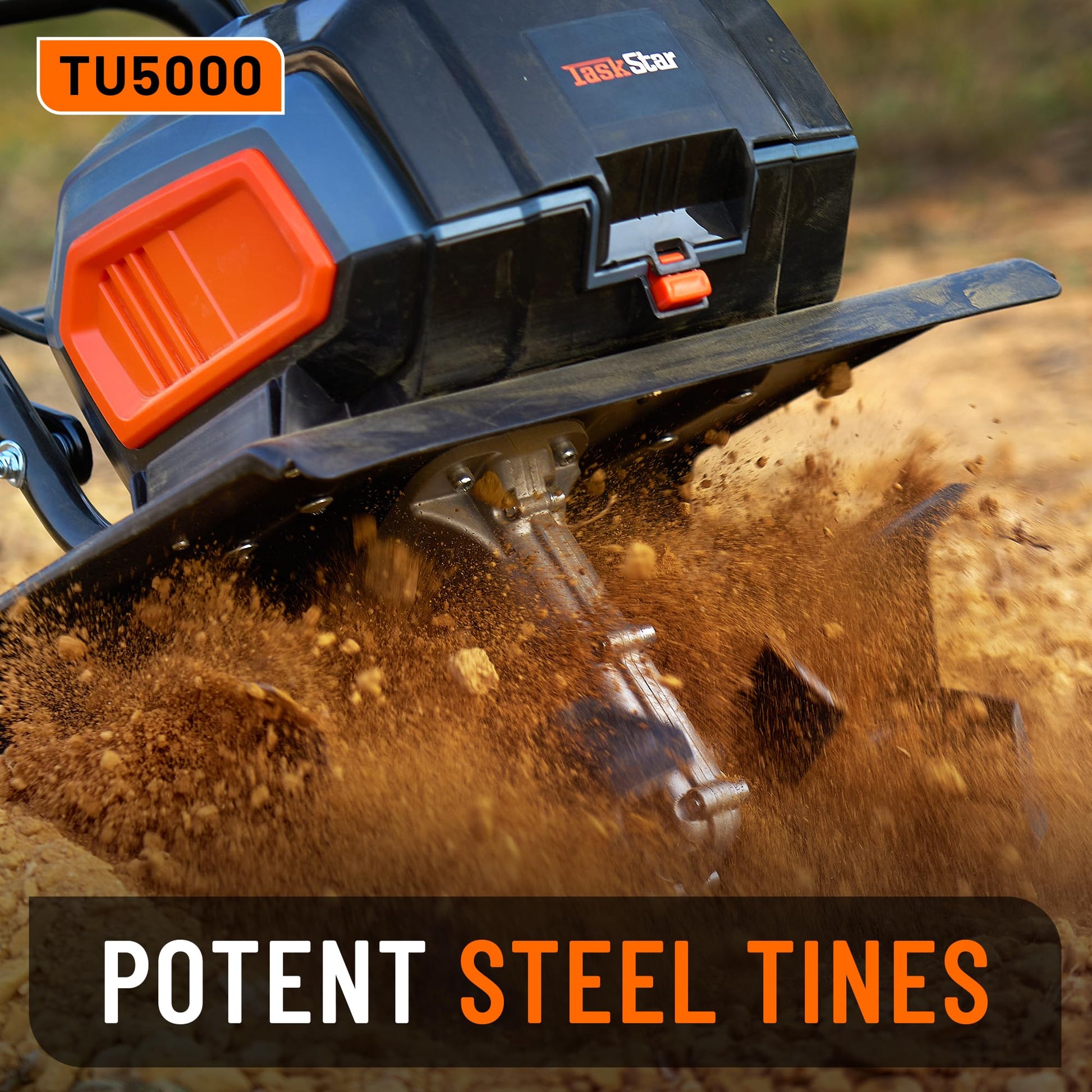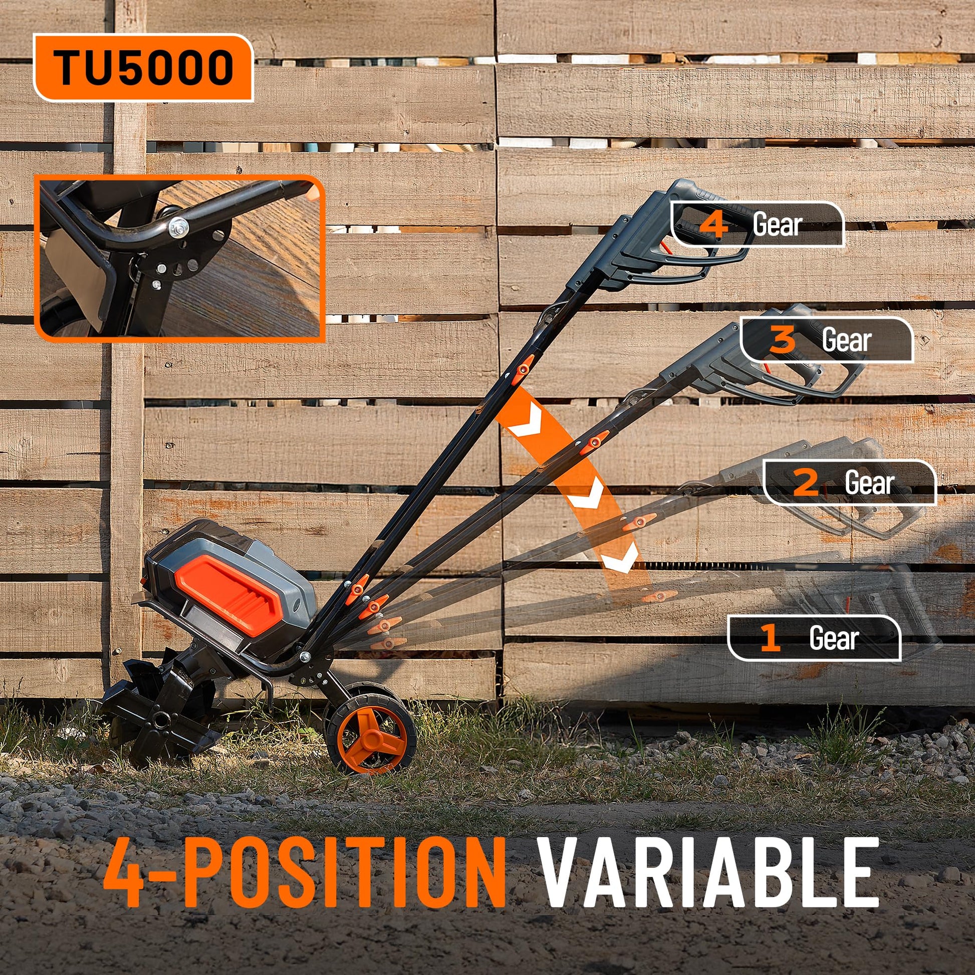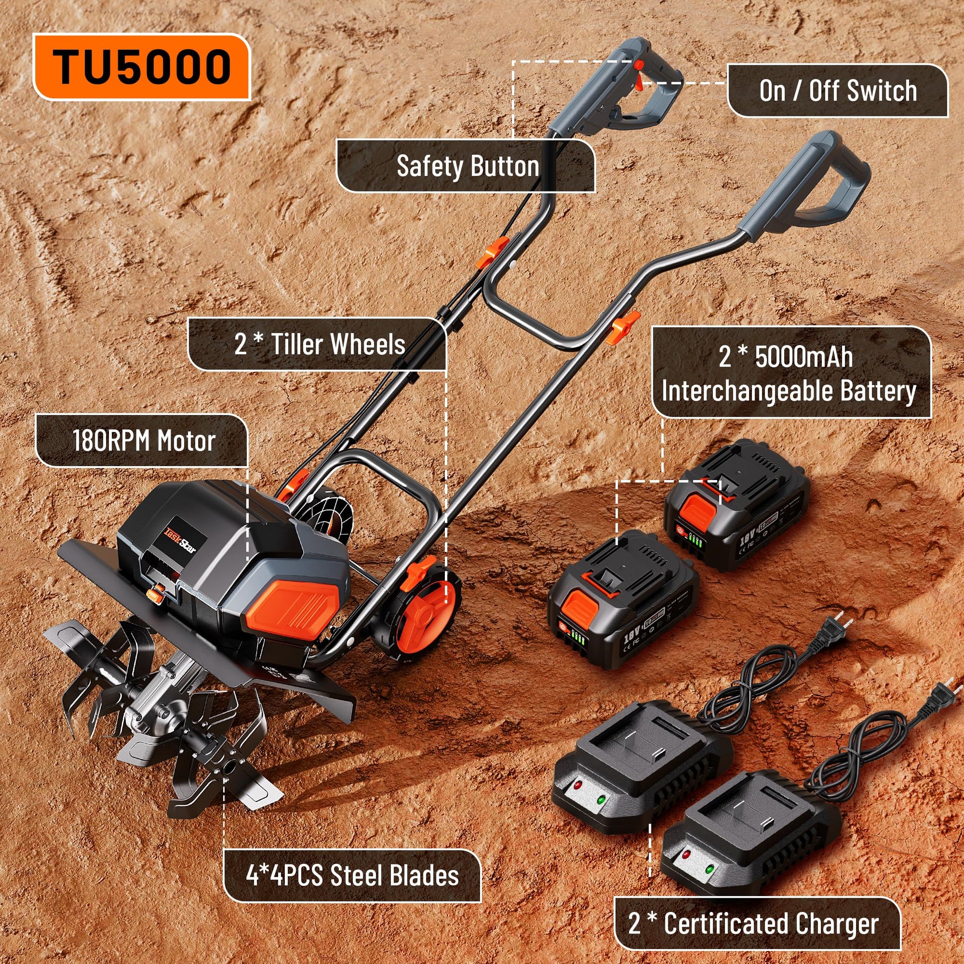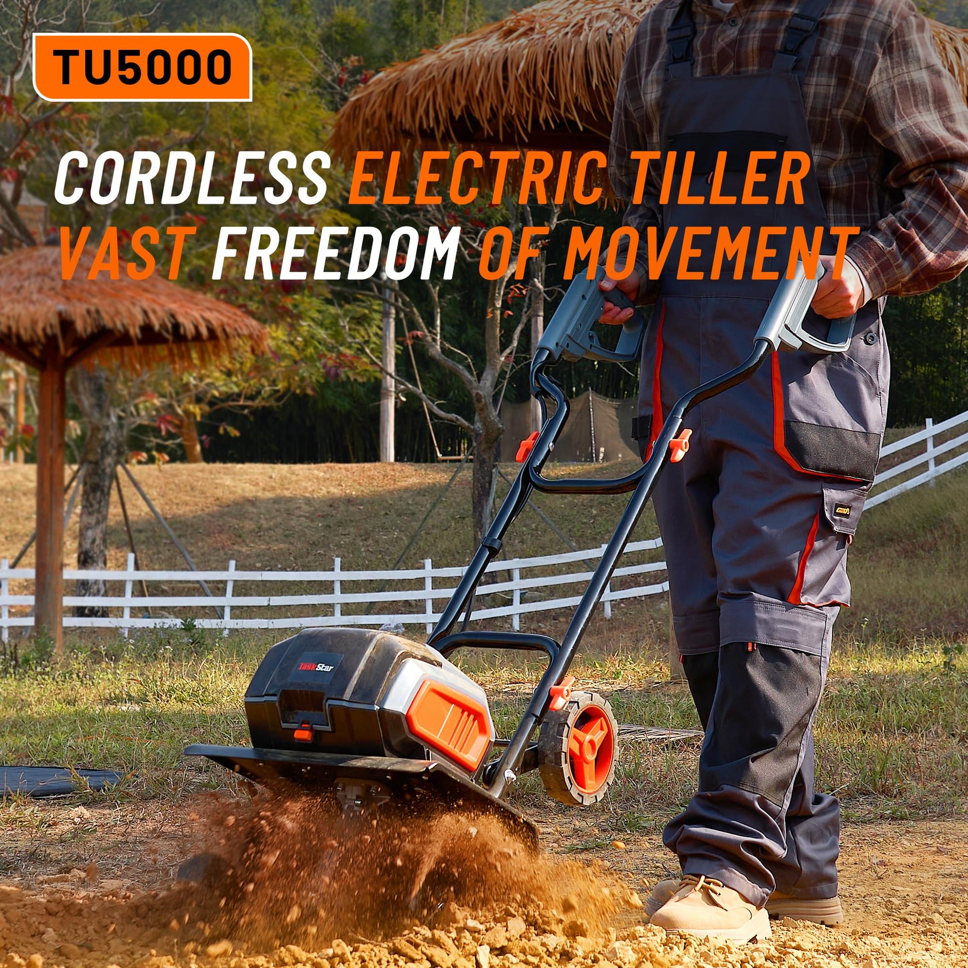 Versatile Garden Companion: TU5000 cordless electric garden tiller is perfect for pre-tillage, breaking up clumps, loosening the soil, removing weeds and mix in fertilizers for small to medium gardens, lawns, flowerbeds farms, parks, courtyards and vegetable fields