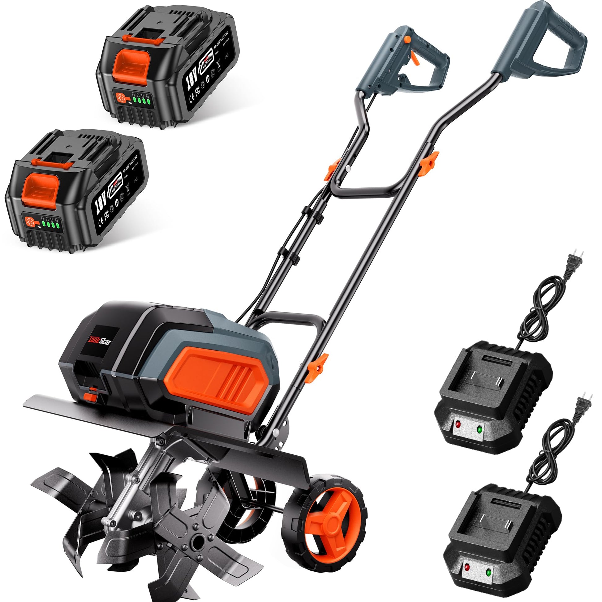 Battery powered cordless tiller is designed with 2 rechargeable batteries that allows you to enjoy the freedom of a cordless design. You don't need to worry about plugging it in and a power cord getting in the way, or filling it up with gas
