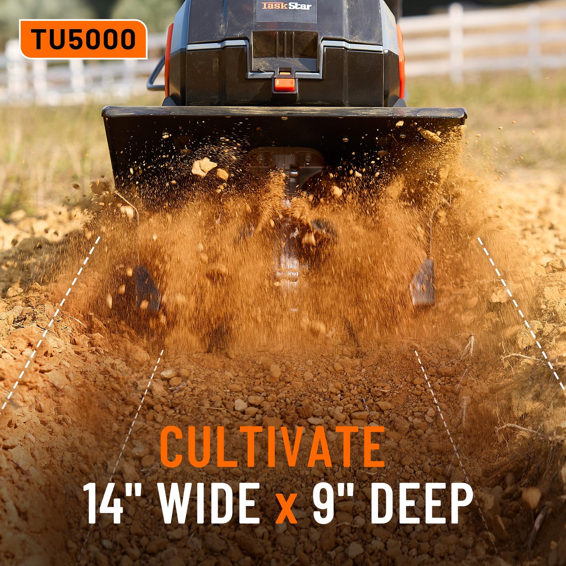 14 "Width & 9" Depth : TU5000 electric tiller with a width of 14" and a depth of 9", allows you to cover a larger area of land in a short time, loosen deeper soil, improve your efficiency and save more time for you when weeding, gardening
