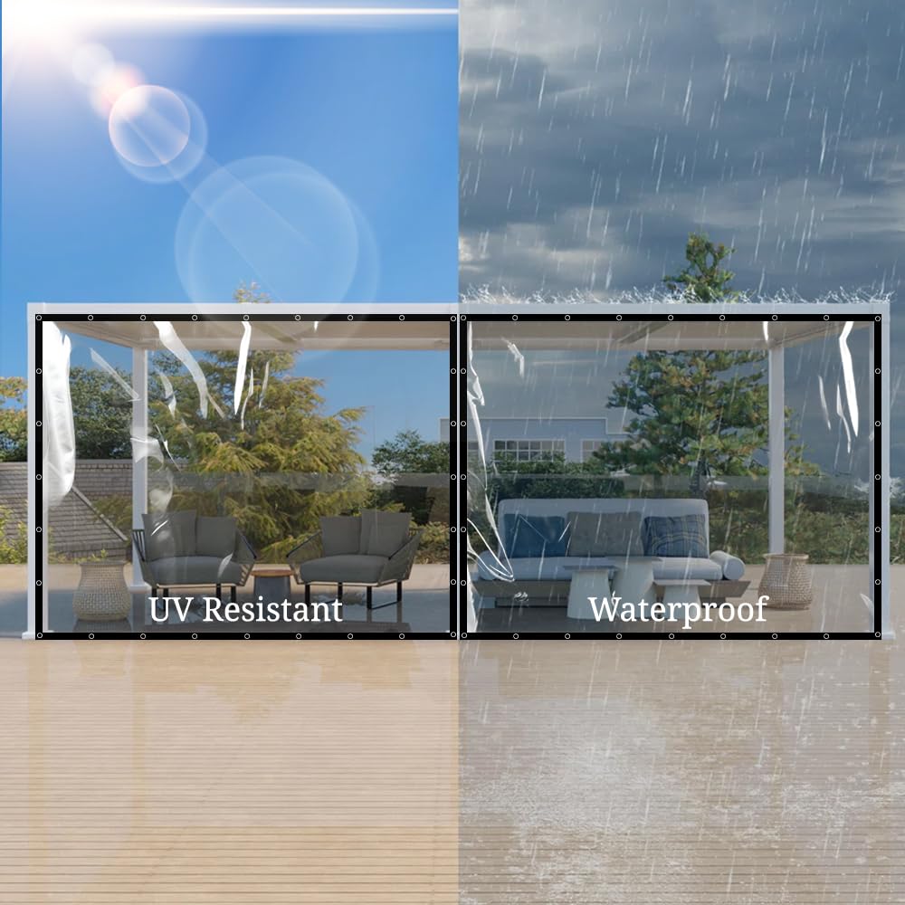 Designed For Year-Round Enjoyment: This 20 mil PVC clear heavy duty tarp offers a premium, all-weather solution, perfect for outdoor patios, porches, gazebos, canopy tent, greenhouses for outdoors and more. The transparent tarpaulin can serve as a waterproof outdoor curtain for patio, letting you enjoy natural light while staying shielded from the elements, creating a comfortable space in any season. Use this waterproof tarp as a patio curtain or clear vinyl patio enclosure, pergola cover.