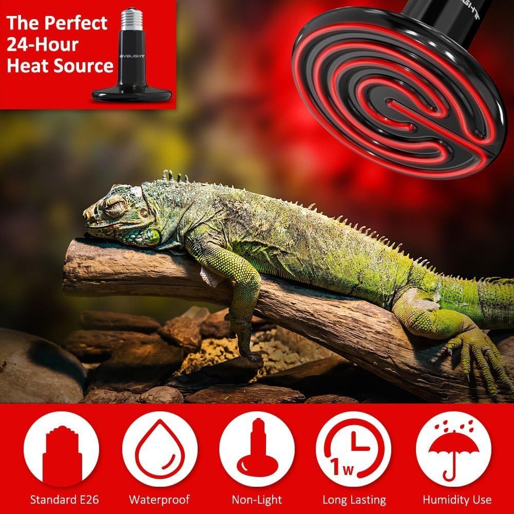 1.✔ No Light Emitted No Harm: Emits a natural “sun-like” infrared heat.This non-light emitting heater bulb offers an excellent 24 hours heat source and will thoroughly heat any reptile without the disturbance of an additional light source.