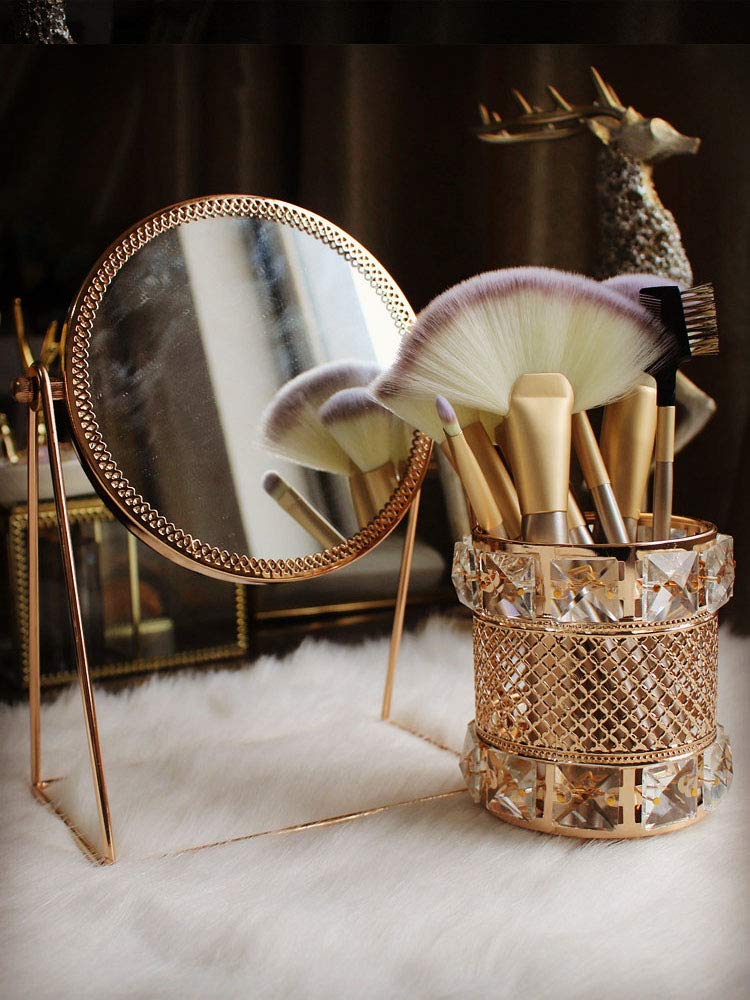 ALL HANDMADE:The makeup brush organizer is finished all-metal welded structure it‘s durable and each crystal on the make up brush holder is hand-inlaid, compact and firm without fear that it will fall.