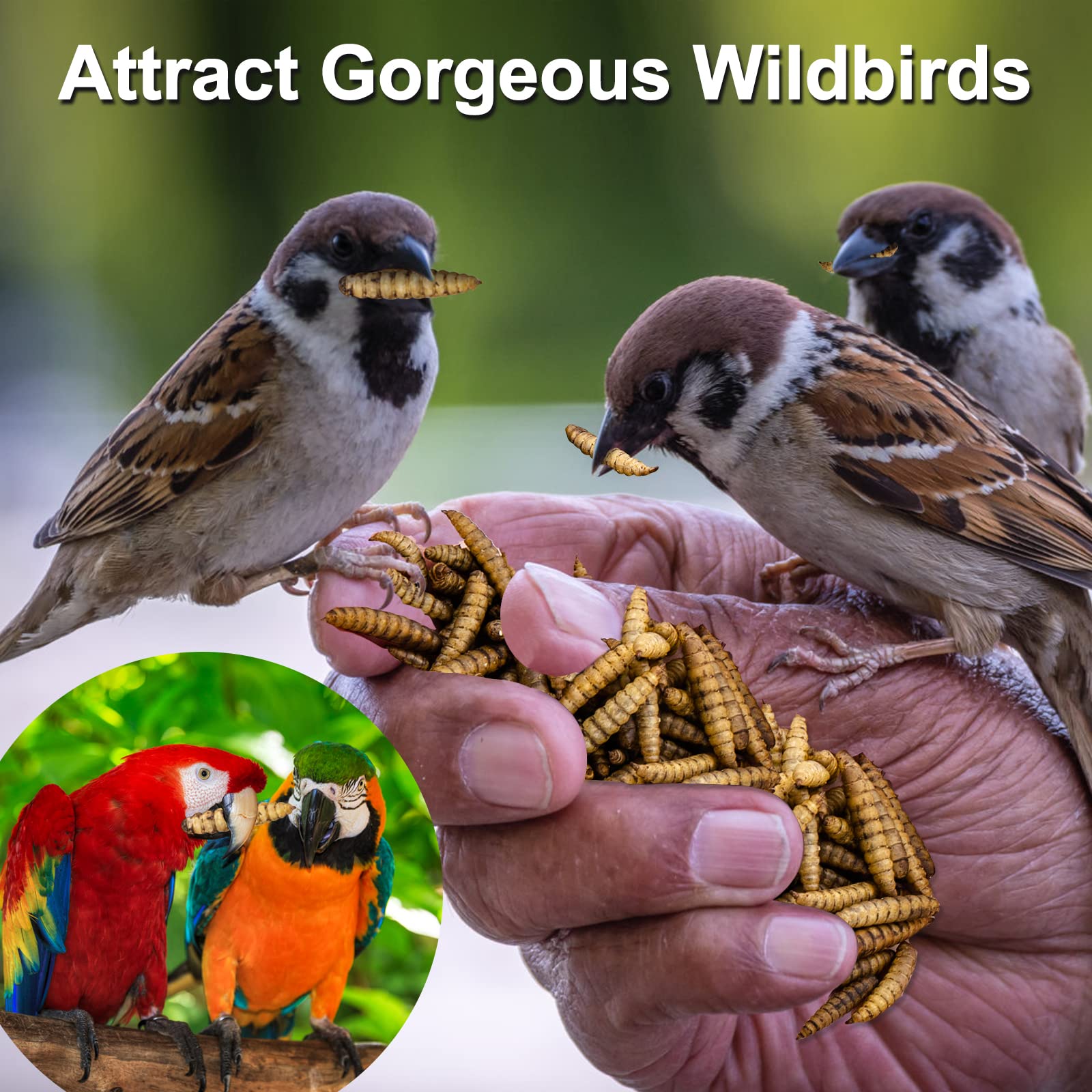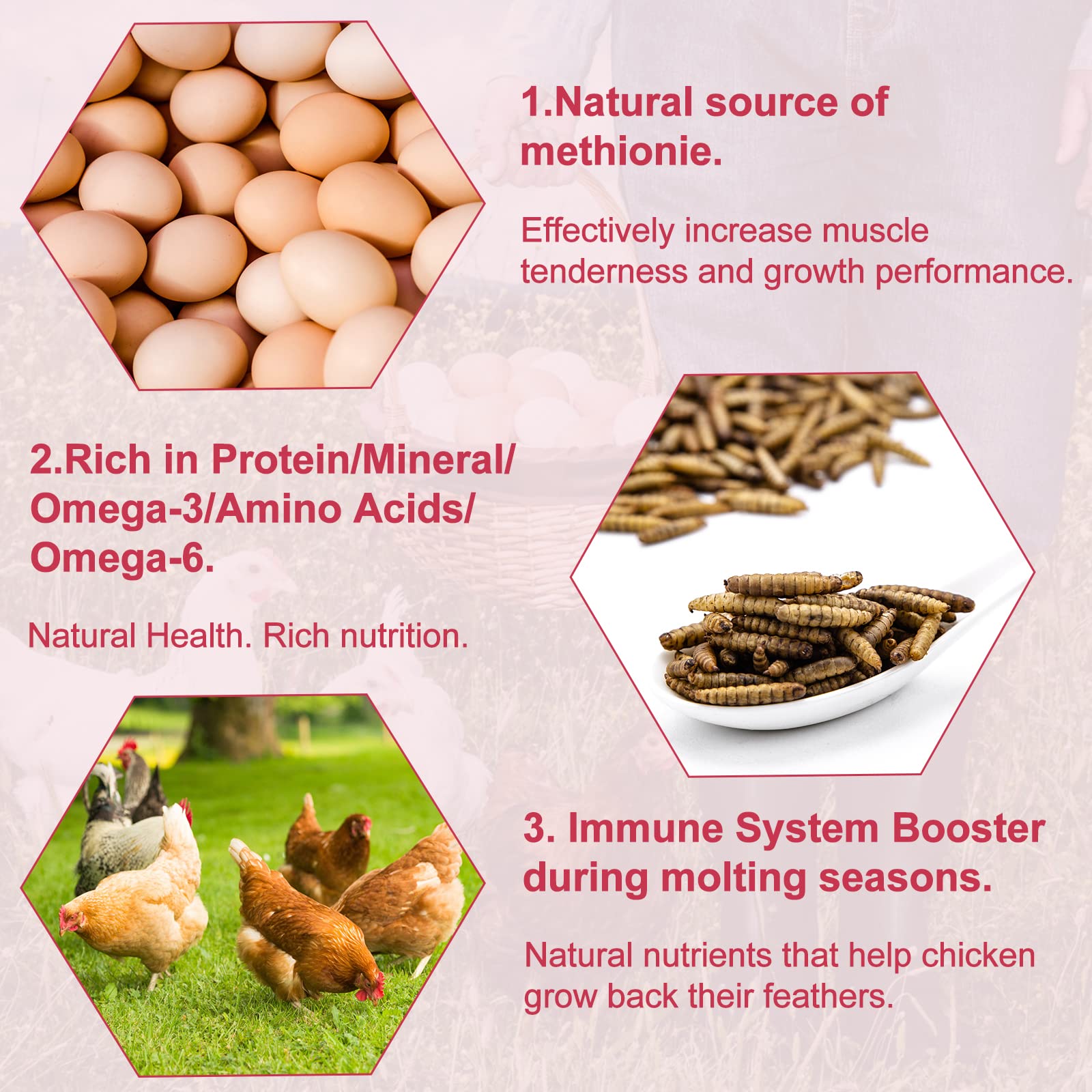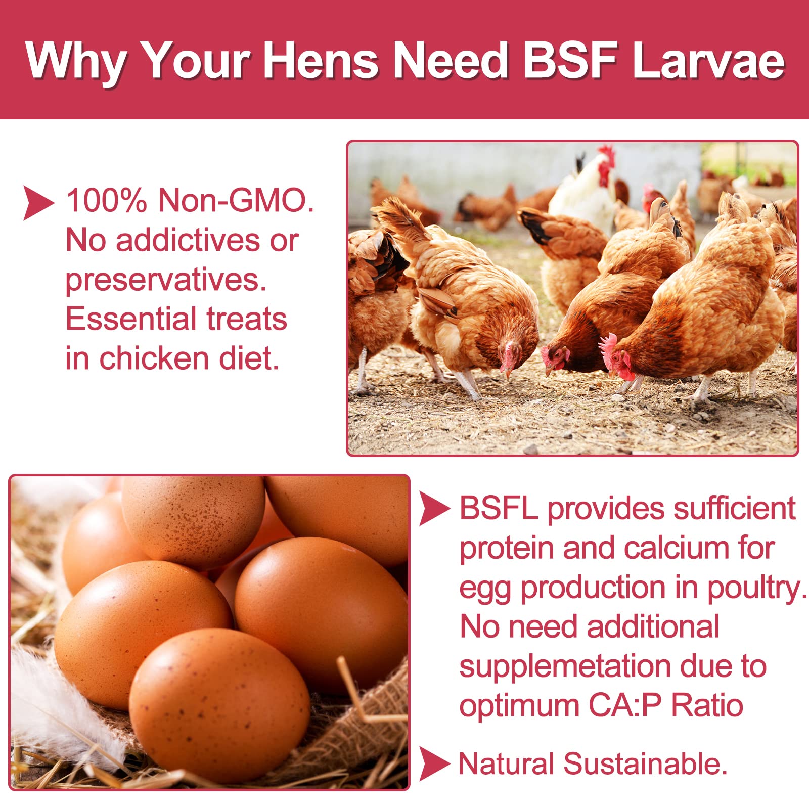 DEVELOP CHICKEN NATURAL BEHAVIOR: Birds love having BSF larva as thier daily treats, scatter the grubs on the ground and chicken will forage in grasses, leaves and peck at the larva. With BSF larva, it's easiler to encourage natural feeding behavior of your pets. Also, BSF larva placed in the bird feeder will attract wildbirds. Truthfully great treats for laying hens, roosters, ducks, turkeys, quails, geese, and other fowl too