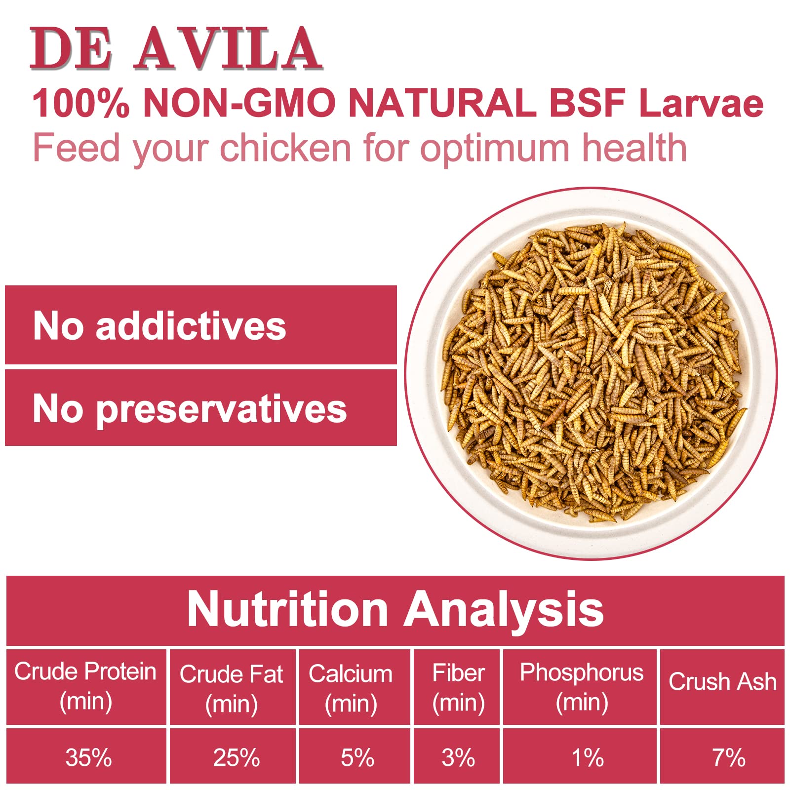 ESSENTIAL NUTRIENTS FOR BACKYARD CHICKEN: 85 times more calcium than mealworms. DE AVILA 10LBS Oven-dried Black Soldier Fly Larvae are packed with protein, calcium, phosphorus, fiber, lysine, and dietary fat. Replacing 3%-5% of chicken feed given each day with BSF larva will help boost immune system for healthier living