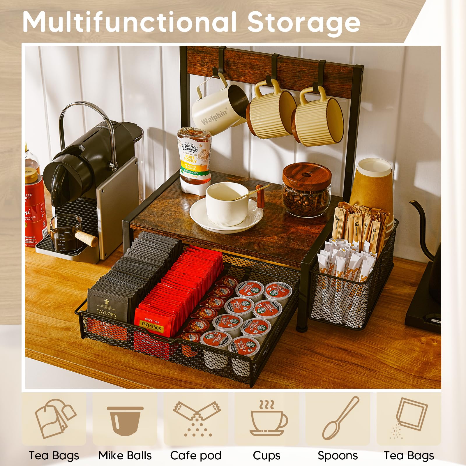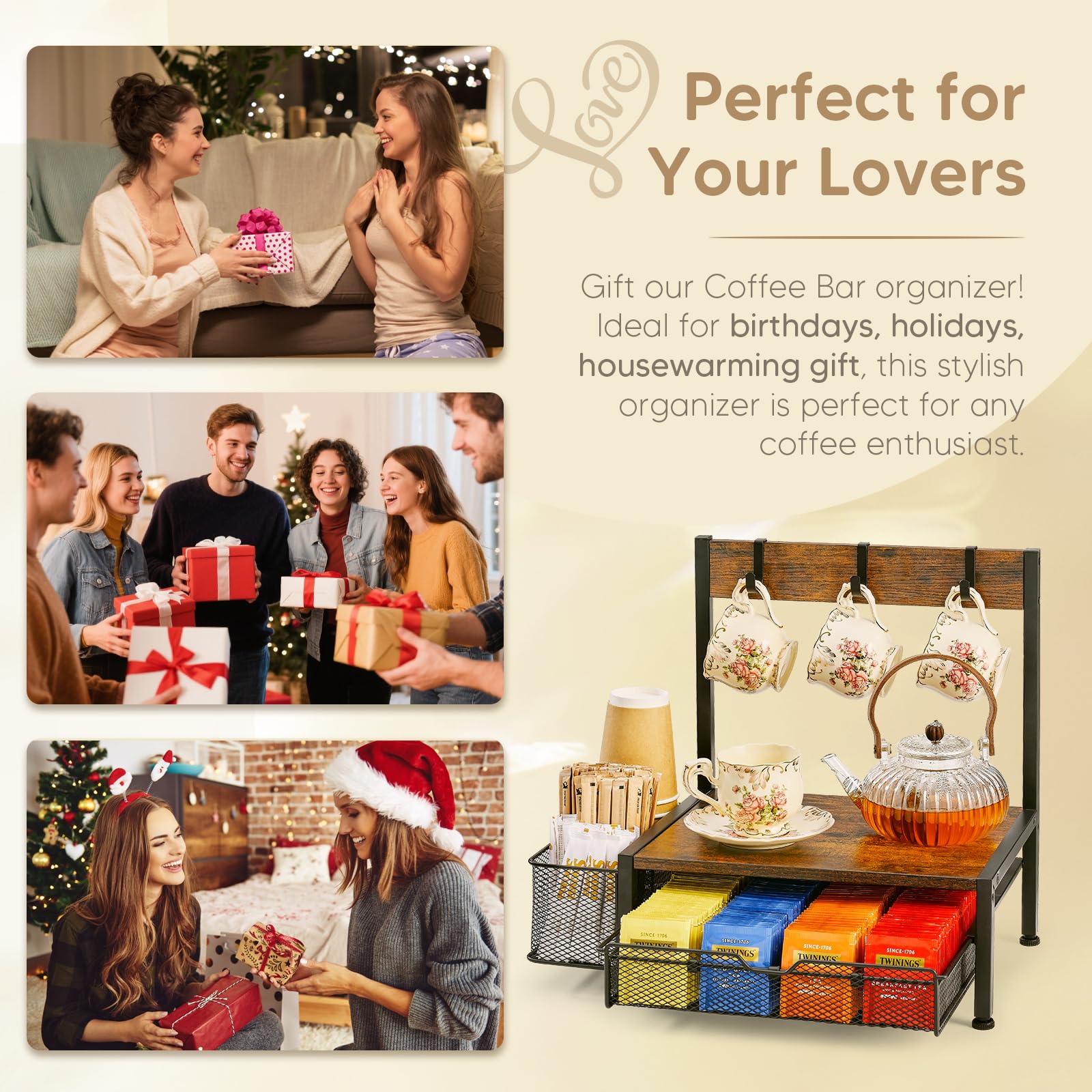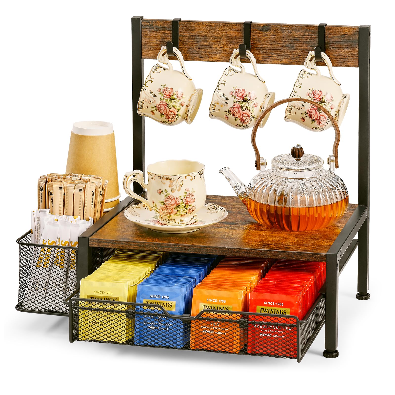 DGWJSU Tea Bag Organizer, Wood Tea Organizer and Storage Cheast, Tea Bag Holder with Storage Drawer, 4 Hooks for Tea Cups Holder, Tea Station Chest Display Container Box for Countertop Kitchen, Brown