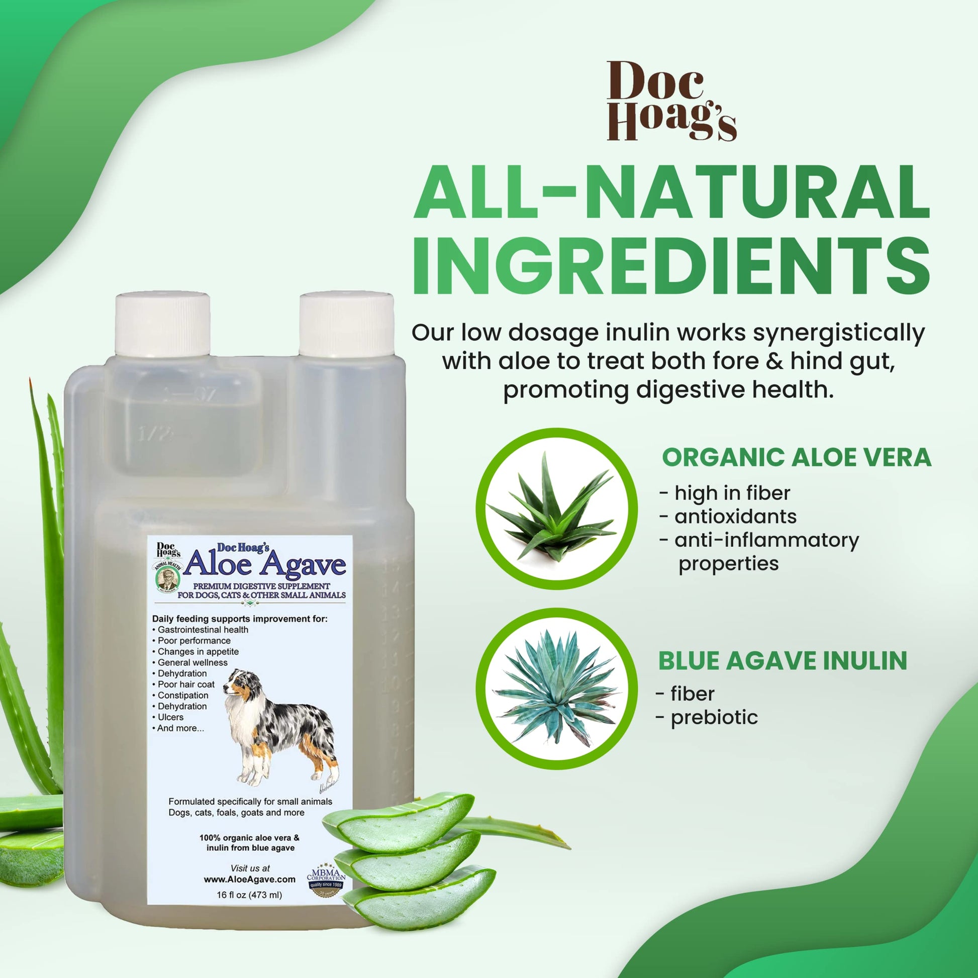 MADE IN USA. Proudly manufactured in the USA, Doc Hoag’s Natural Aloe Vera Agave Dog Supplement ensures premium quality, safety, and consistency for your pet's well-being.