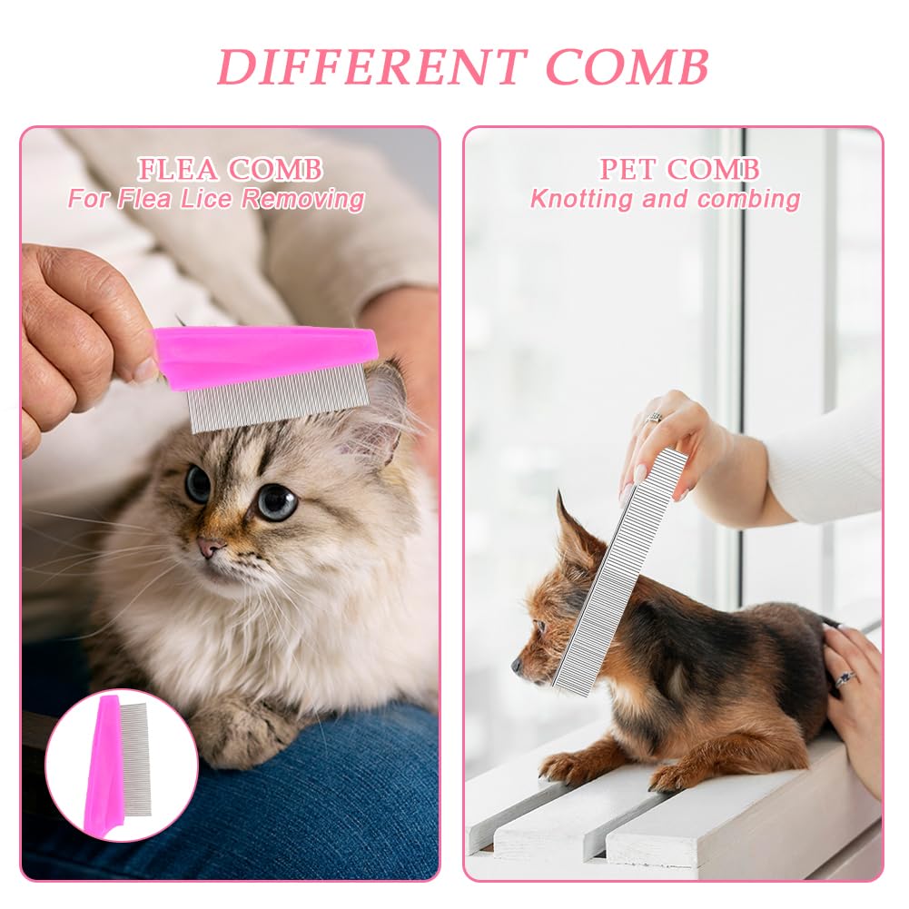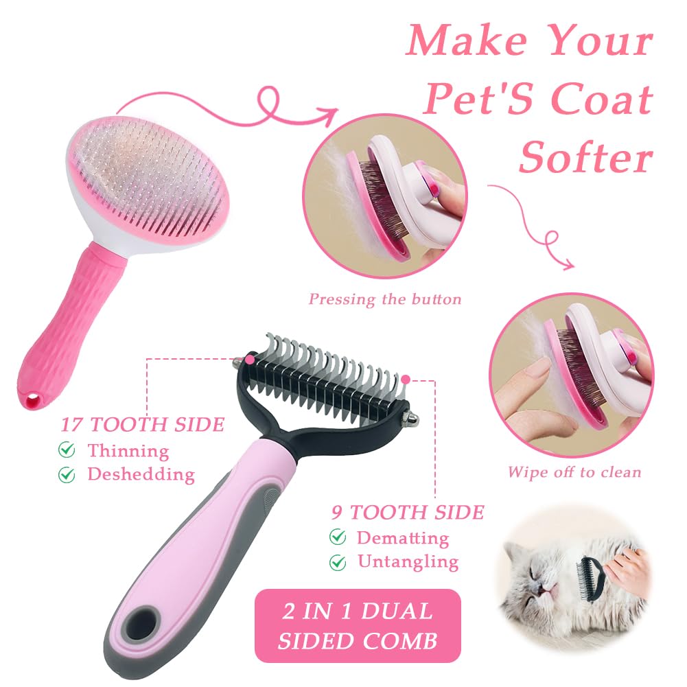 10 Pieces Set:Dog grooming brush kit including all the tools you need for your pet's daily care and shedding: self-cleaning brushes, double sided shedding rake, bathing brushes, coarse and fine-toothed rows of combs, flea combs, grooming clippers, pet nail clippers, glove combs, and nail grinding pads.