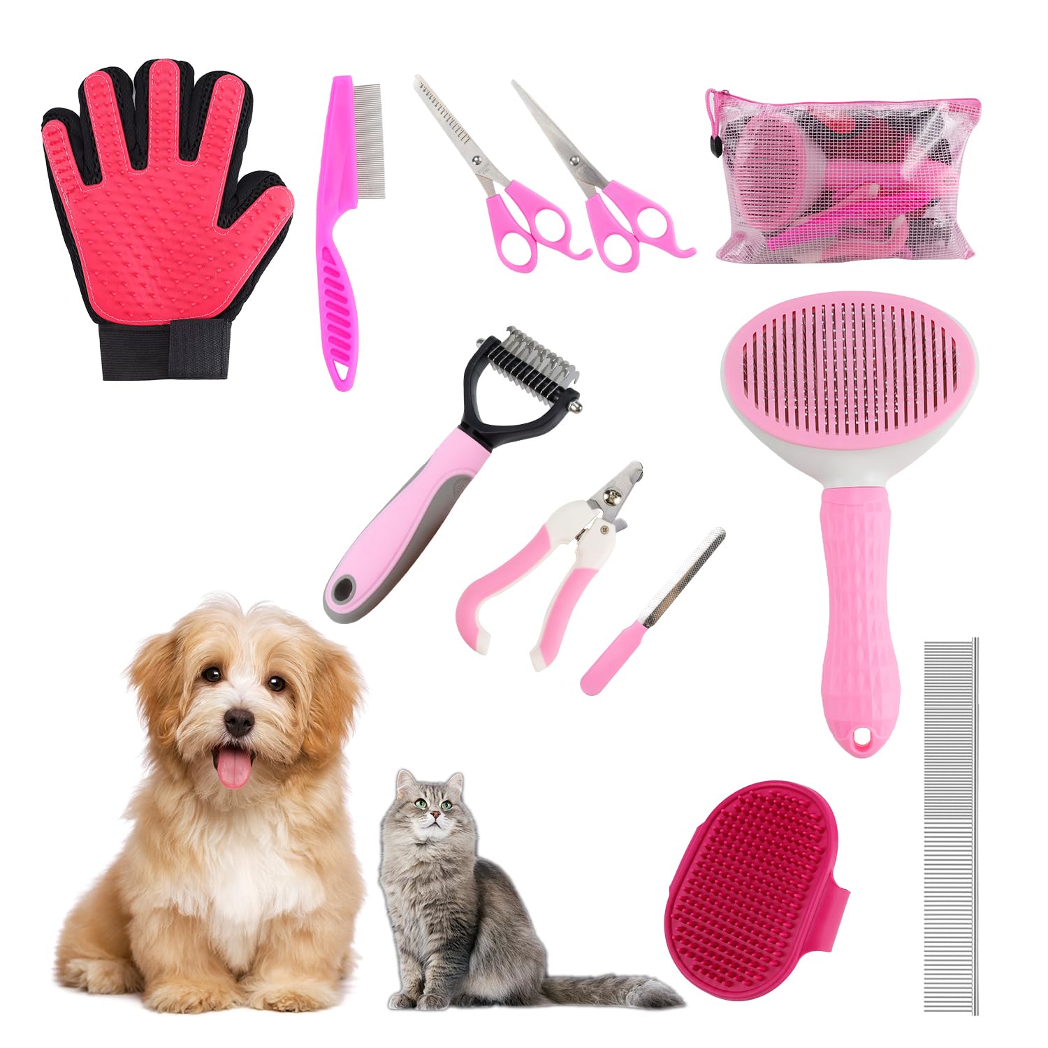 Dog Grooming Brush Shedding Kit, 10 Pcs All In One Pet Self Cleaning Kit with Slicker Brush, Deshedding Tool, Dog Grooming Scissors, Pet Nail Clippers and File for All Breeds of Dogs and Cats