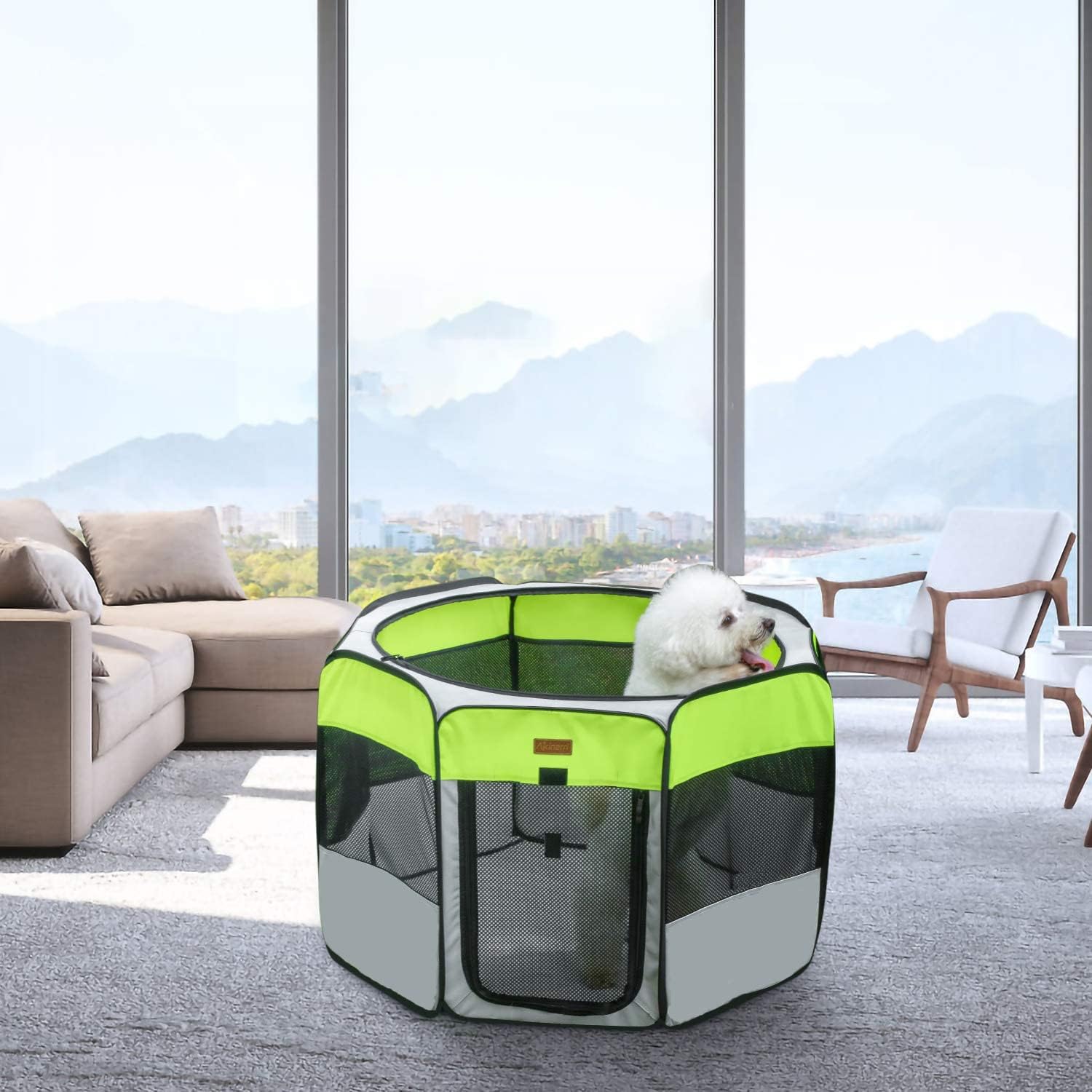 【EASY TO SET UP & CARRY】▶▶▶The pop-up design ensures that the Pet Play Pen is set up in seconds with no assembly required; when not in use it can be folded into the carry bag we have provided for easy carrying and storage. Perfect for indoors, lawn, beach, park, travel, camping and more!