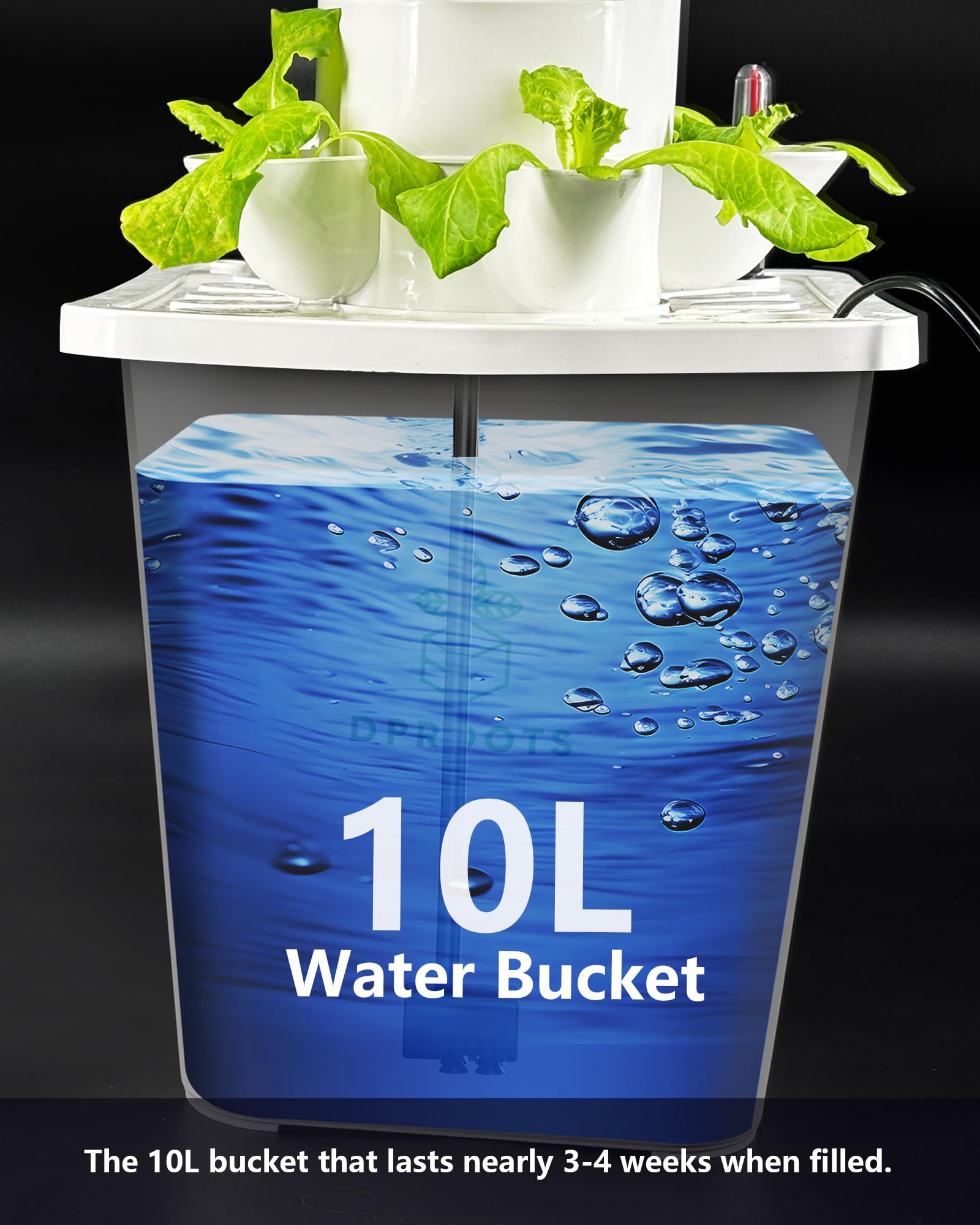 Easy to Water Management:The hydroponic tower includes an 10L bucket that lasts nearly three to four weeks when filled, equipped with a water level gauge for easy monitoring; A folding funnel simplifies water refills without removing the bucket