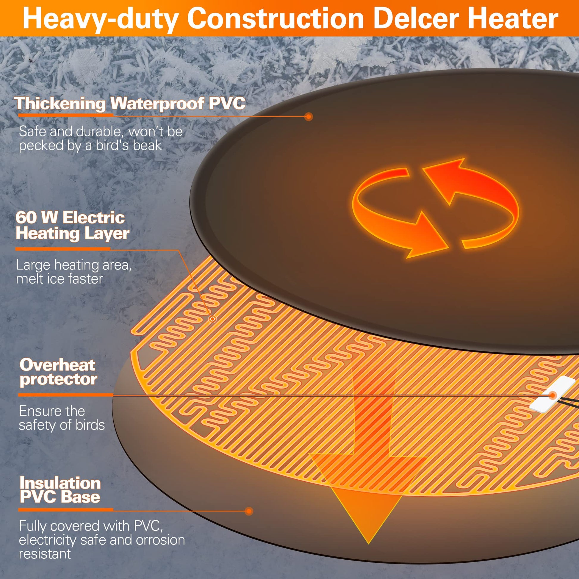 Efficient Ice Melting: the bird bath deicer is designed as a 9.45 inches diameter disc; The bird heater has a large heating area and high deicing efficiency