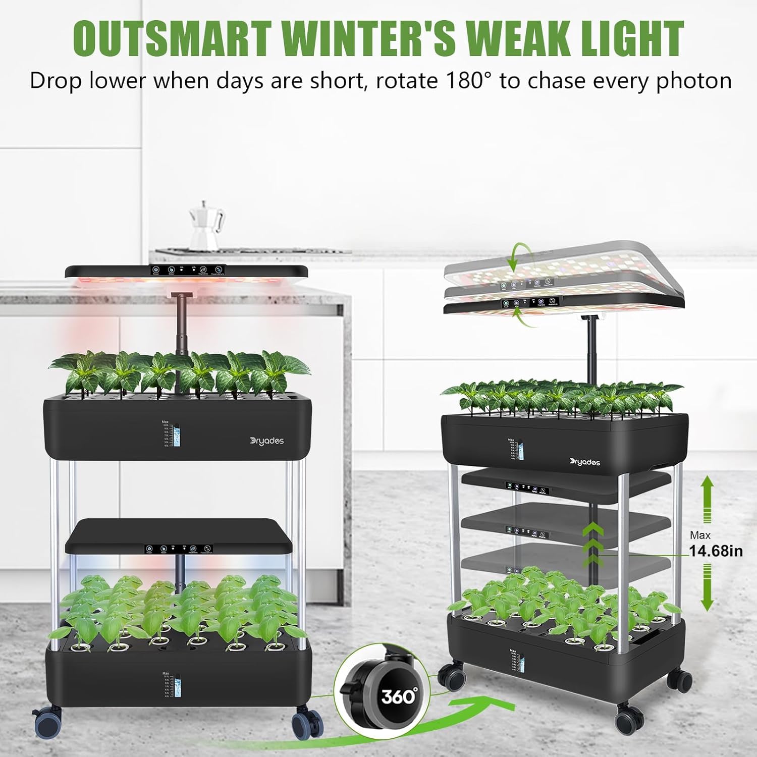 Powerful Dual Full-Spectrum LEDs + Adjustable Lighting: Dual 53W LEDs deliver both red & blue spectrum to support all stages of plant growth.The adjustable lamp pole can be tilted or raised as plants grow, ensuring even light coverage and stronger growth.