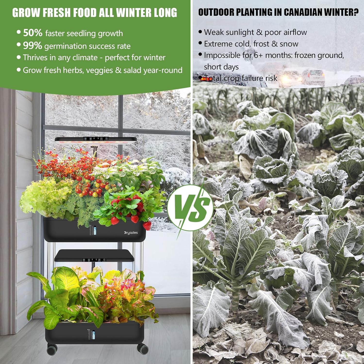 Smart Usage Features & Reliable Support: Includes preset light cycles (e.g. 16/8 or 22/2 hours) to automate day/night routines. Mobile wheels allow easy positioning indoors.Seeds are backed by germination support: tips on ideal water pH and temperature included.Plus, warranty & customer service ready to assist (includes seed replacement in case of quality issues).