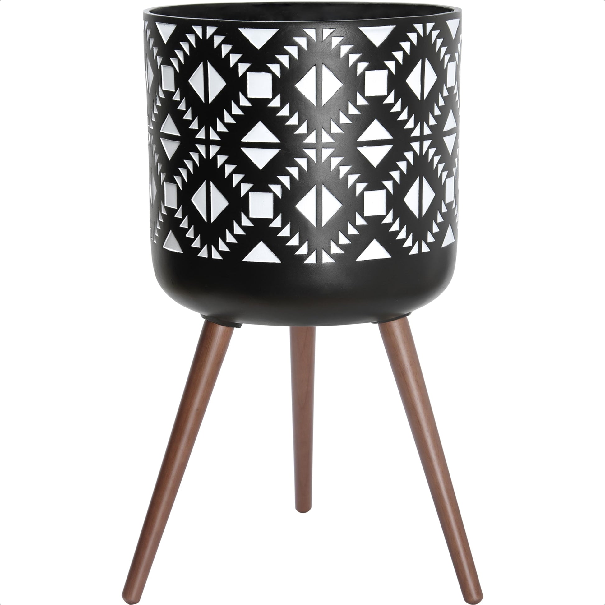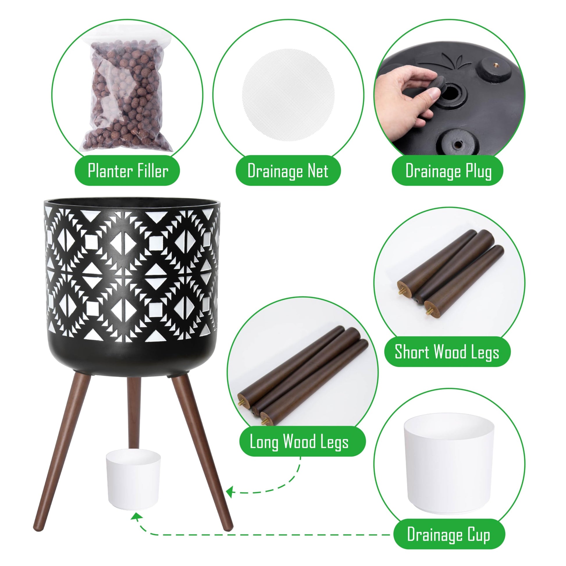 D'vine Dev 16 Inch Planter Pot with Stand, Mid-Century Tall Plant Pot with Legs for Indoor Plants, White/Black, 88-G-E-4