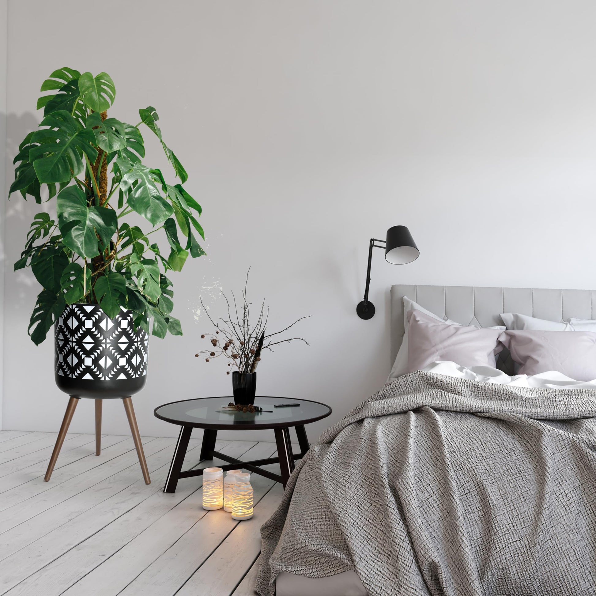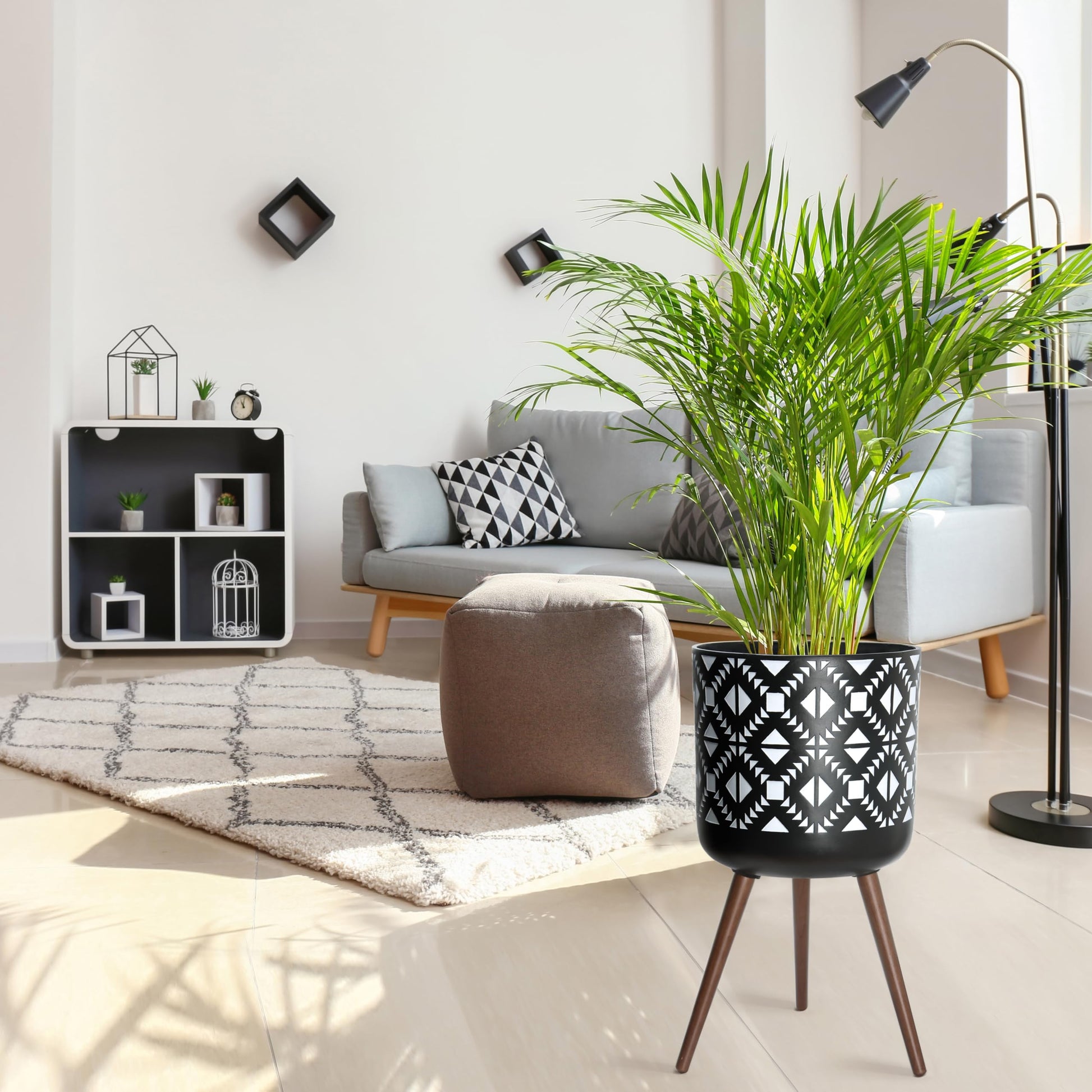 • Sophisticated Design: Mid-century modern aesthetic with a geometric fiberclay pot, complemented by solid wooden legs.