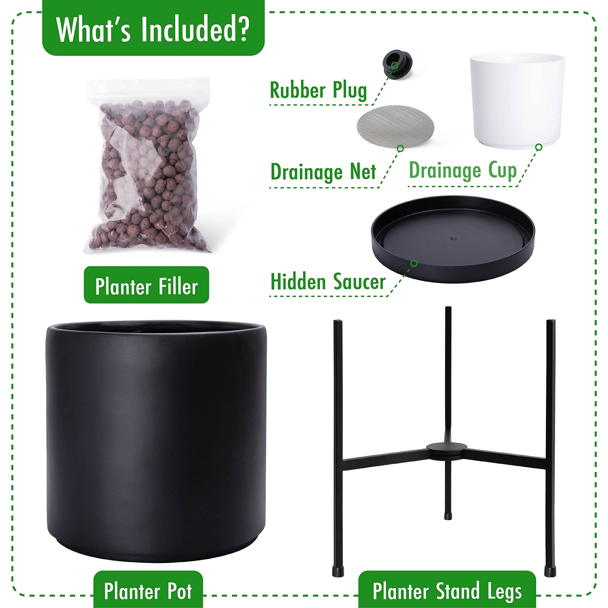 Included: Planter pot with drainage hole, craftwork metal planter stand, mesh net, rubber plug, ceramic balls planter filler, drainage cup.