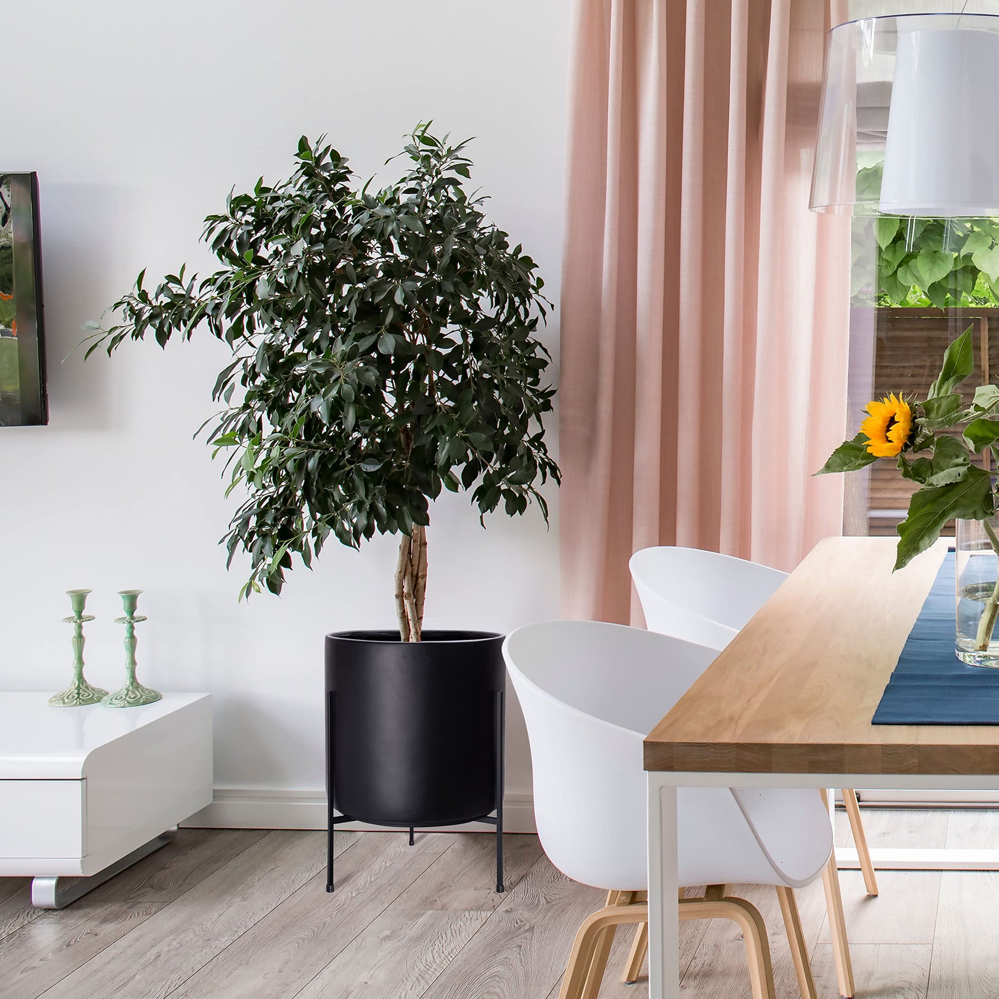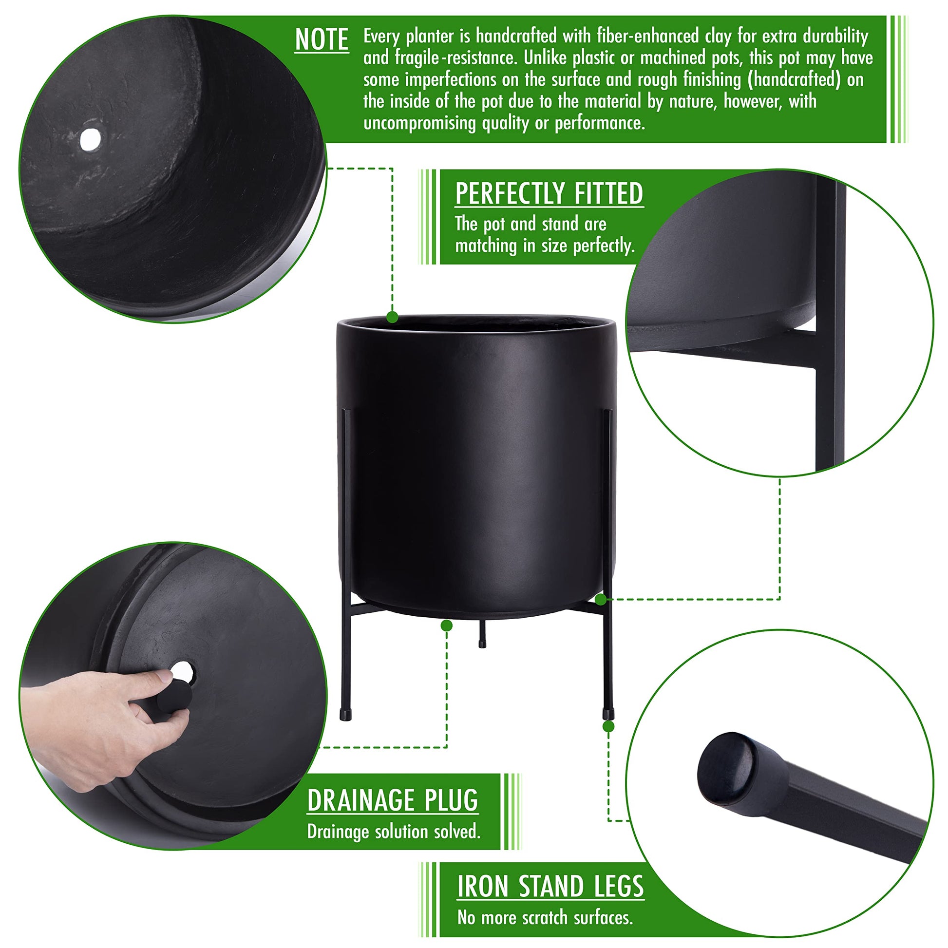 Simple and Elegant Design: Cylinder-shaped pot is simple and elegant. Black color matches well with any plant and decor. Sleek and minimalist stand adds sophistication to your space.
