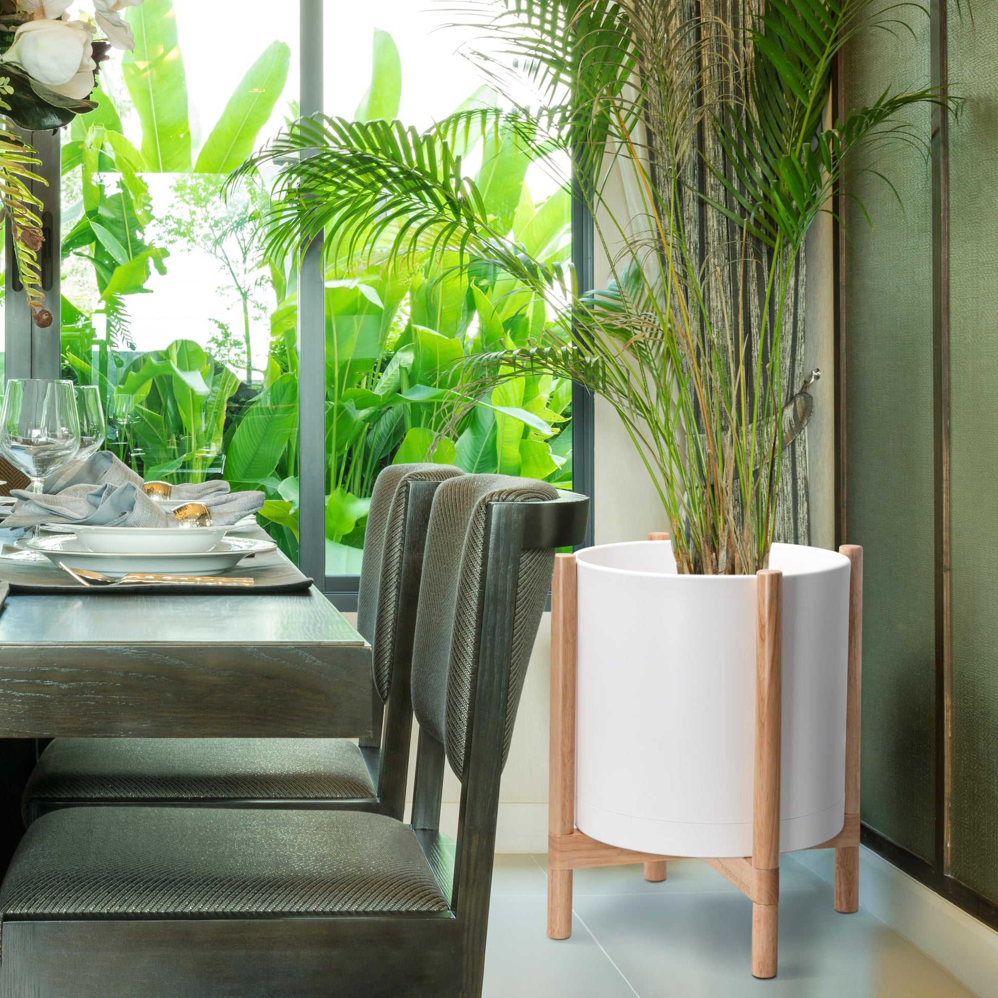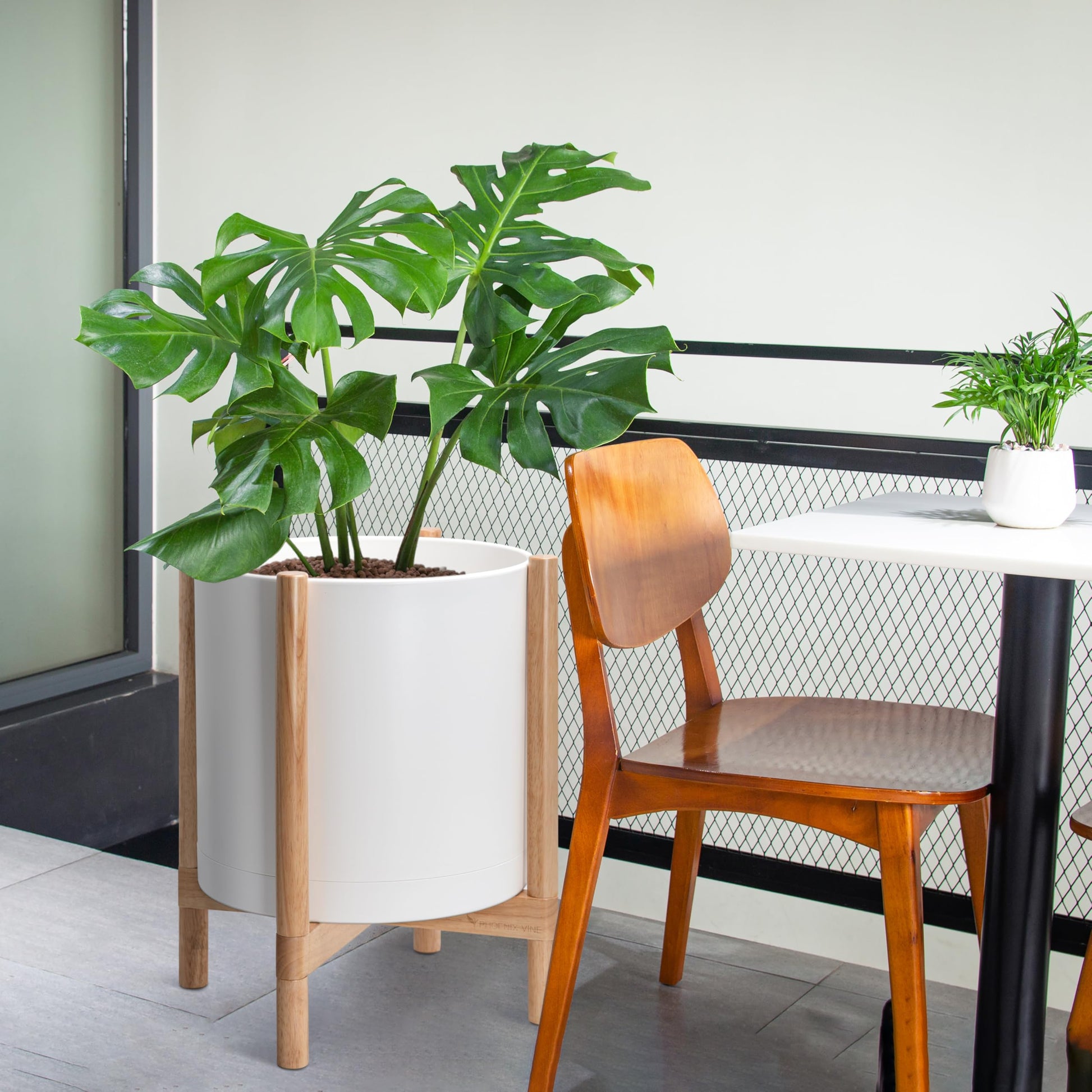 A Complete Set: Minimalist plastic planter, combined with a sculptural, solid wood stand that match perfectly together and looks great in any home.