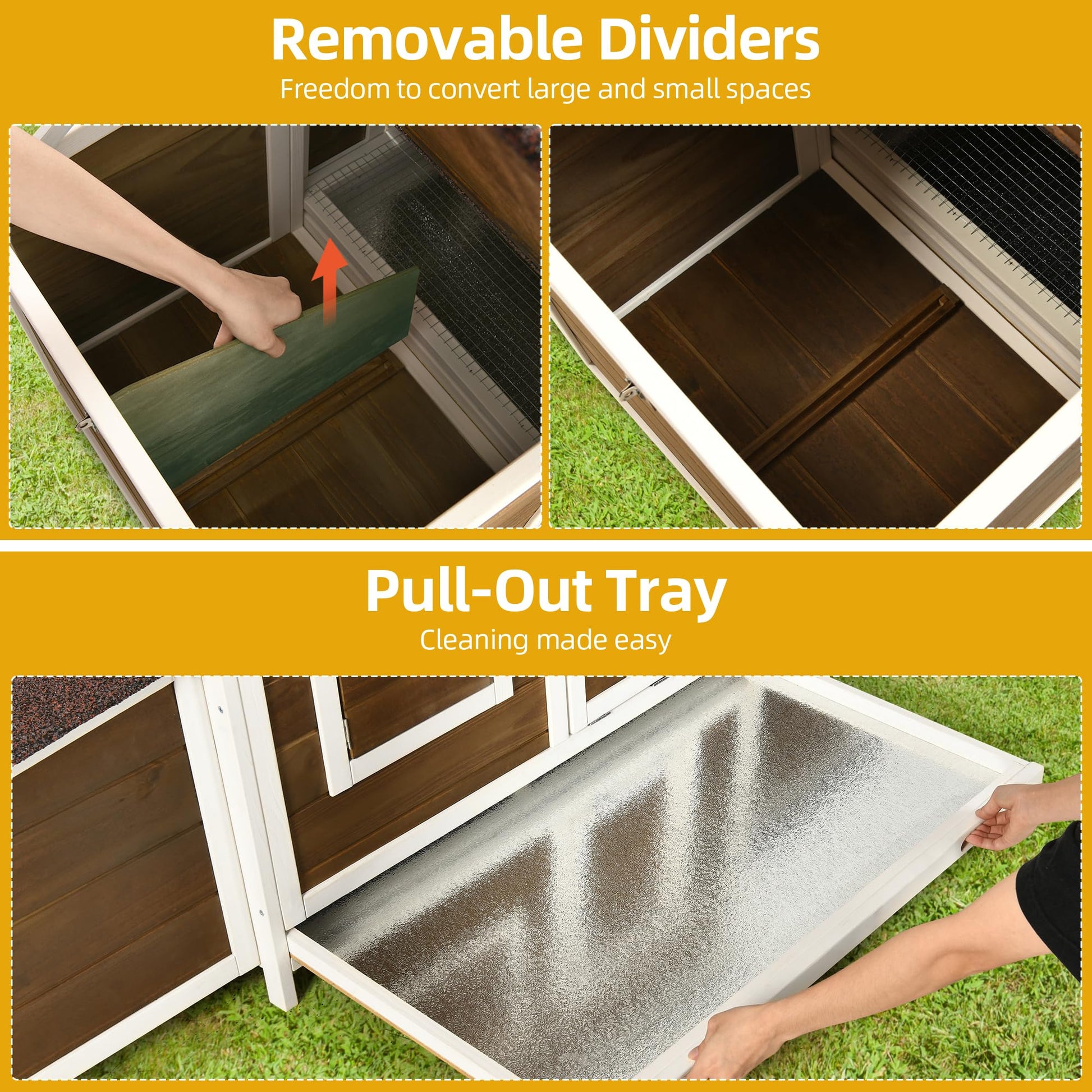 Large, Versatile Nesting Boxes: Two big, comfy nesting boxes (1 each side) with removable dividers. Customize the laying space inside your outdoor chicken pen easily