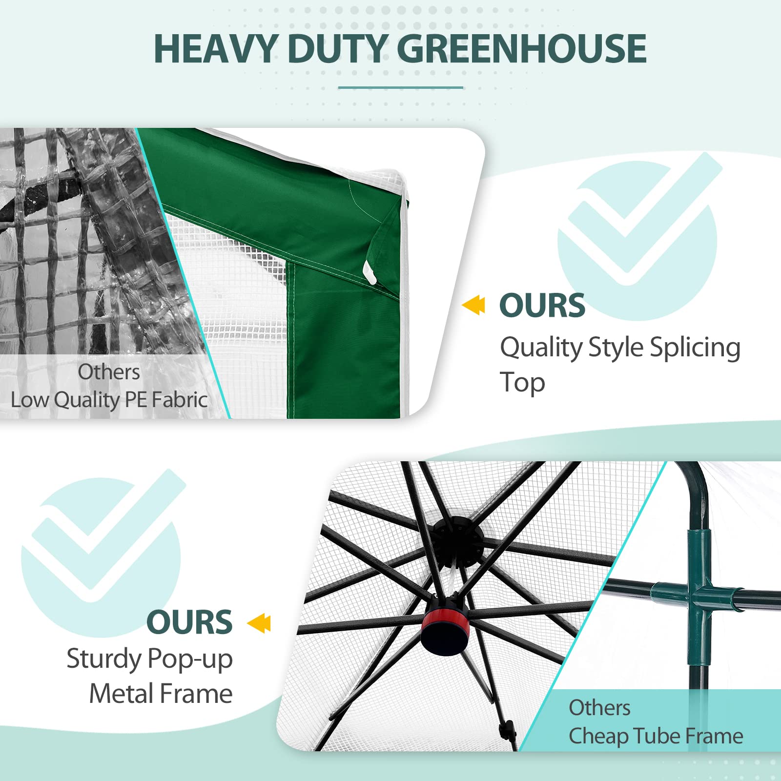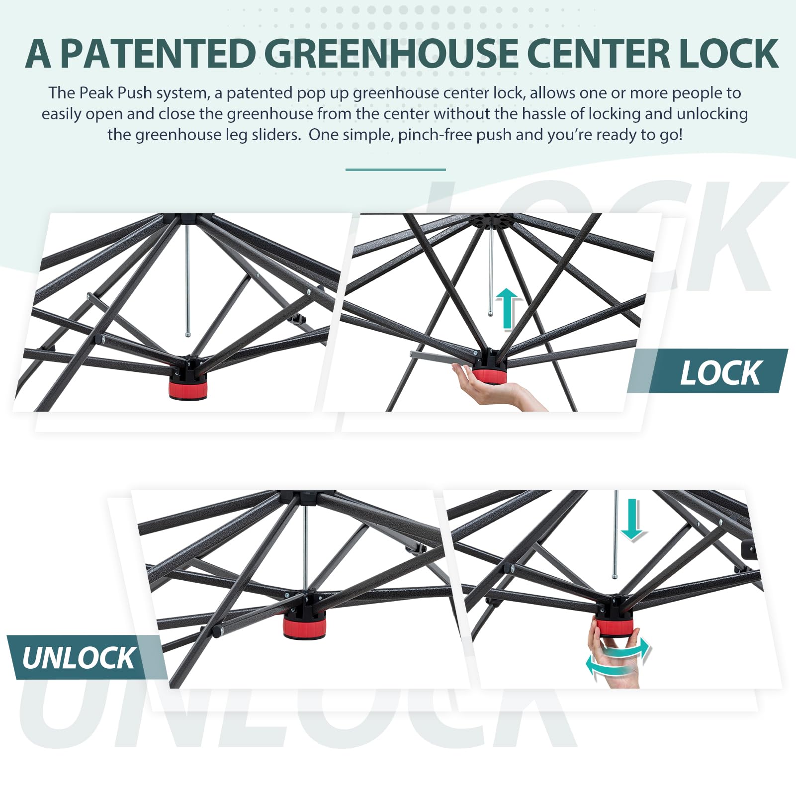 EASY SETUP: This easy setup pop up greenhouse plant tent features the Peak Push system, a patented greenhouse center lock. The portable greenhouse requires no tools and easily opens and closes from the center in seconds. Its unique greenhouse center lock enables a quick, one person setup, letting you maximize gardening with minimal effort