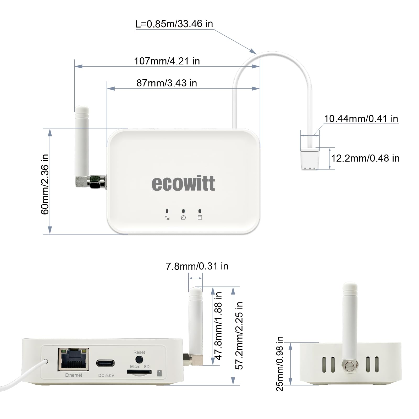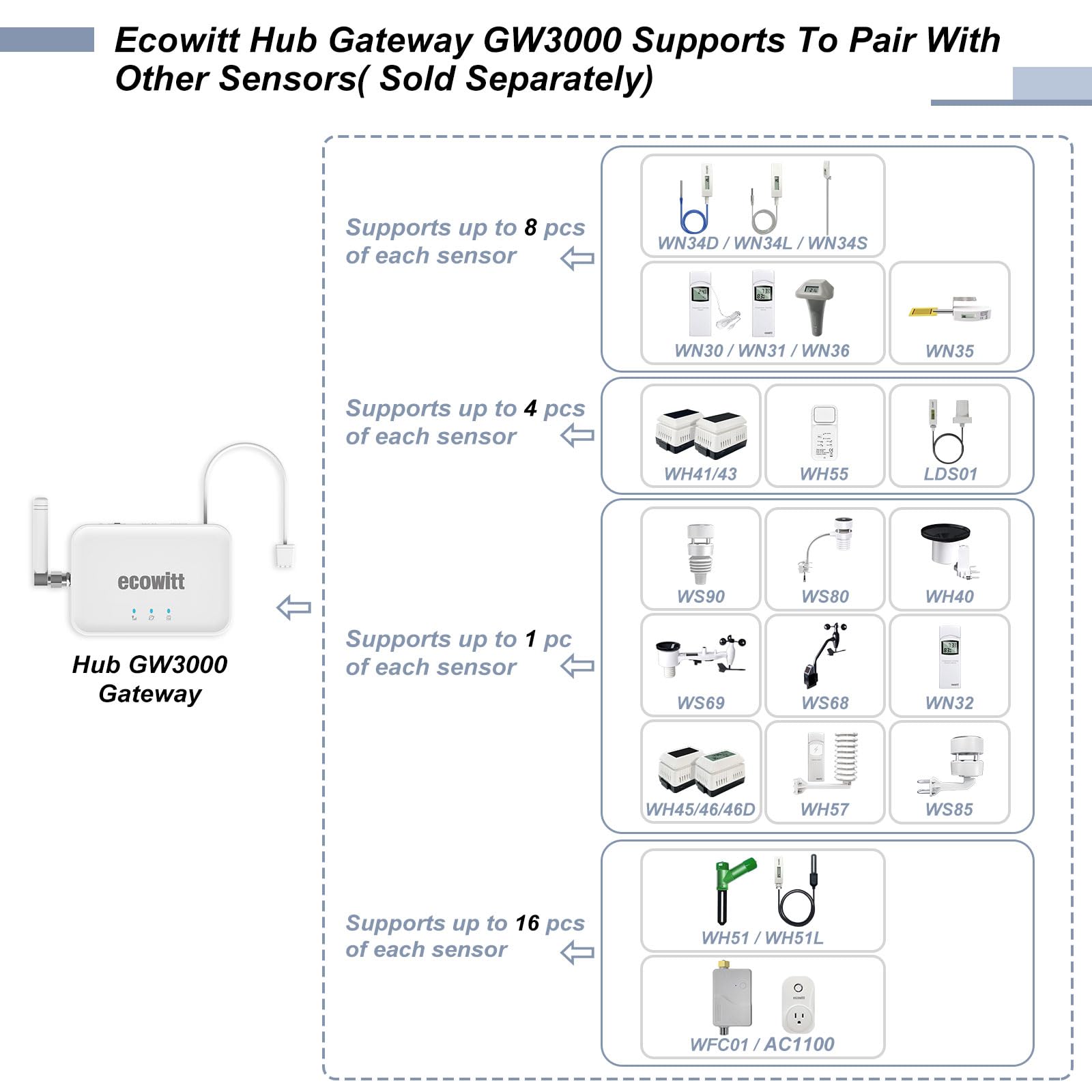 • Upgraded Weather Station Gateway GW3000: The Ecowitt GW3000 Wi-Fi gateway has built-in 3-in-1 sensors for temperature-humidity/atmospheric to measure the indoor data, and comes with an additional 0.9 m/2.95 ft. USB Power Extension Cord with Type_C interface for the power supply. Designed with a WLAN port and an SD card port, it can be used directly over a network cable to avoid the pitfalls of unstable WiFi and can store data on an SD card for data transfer.